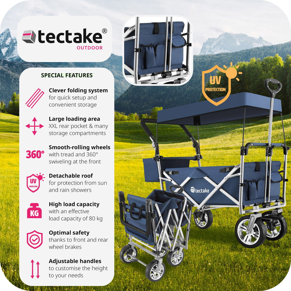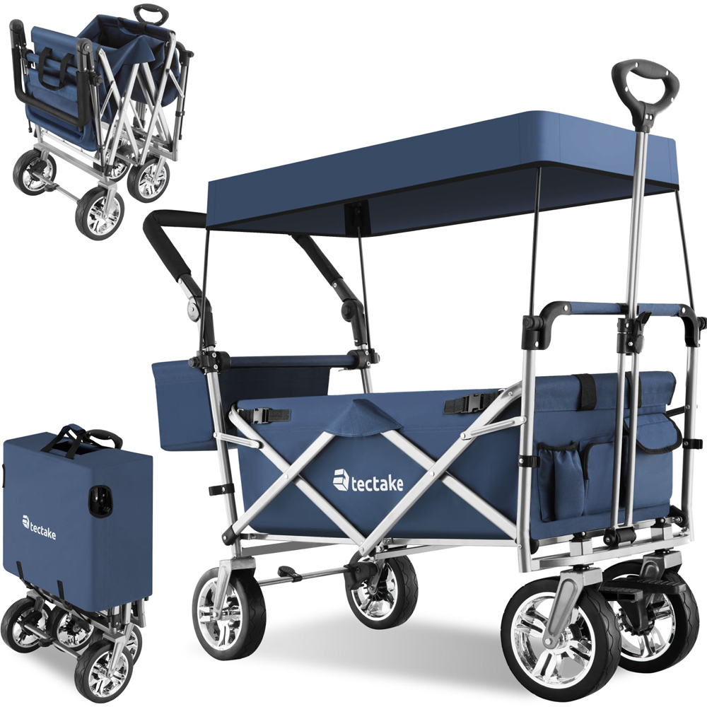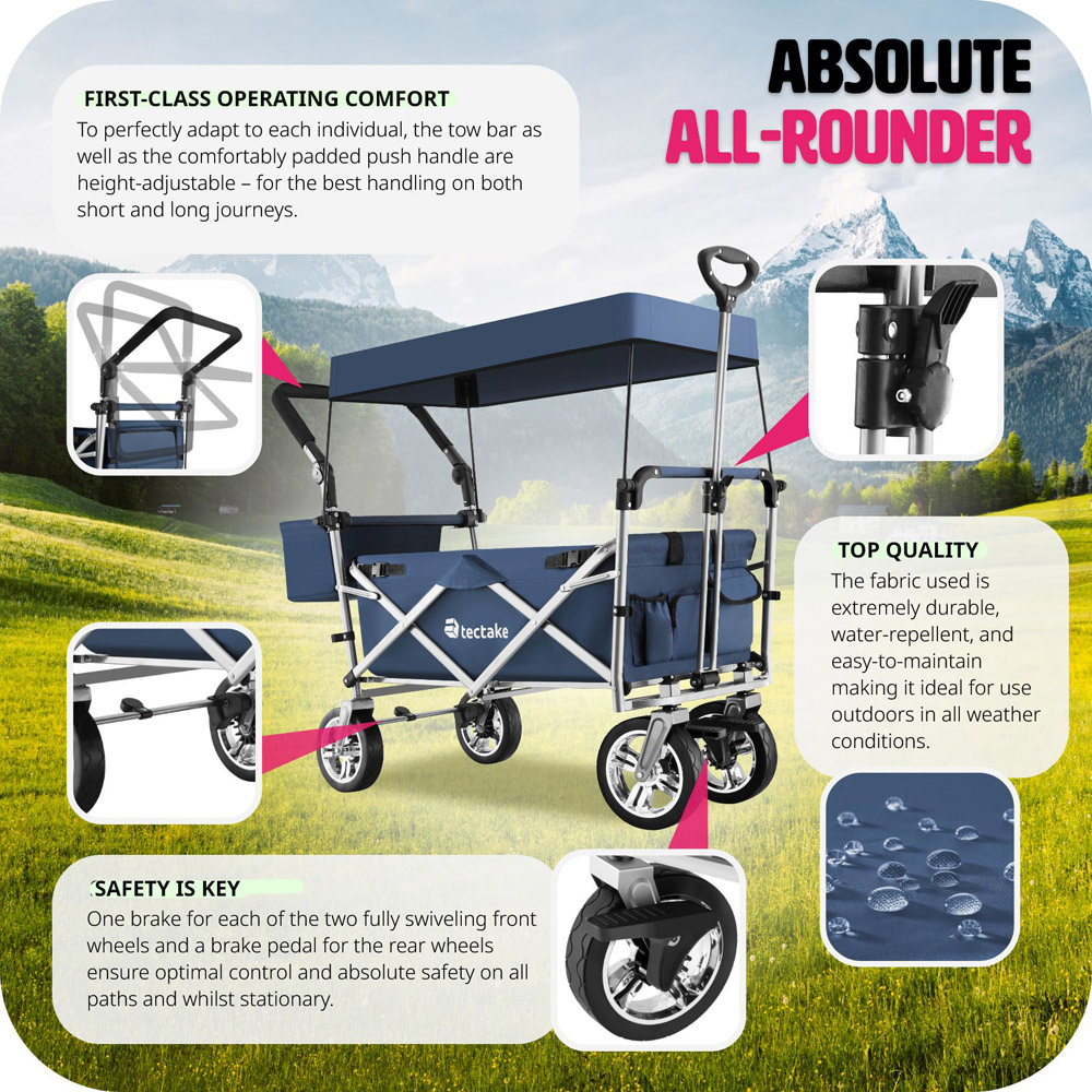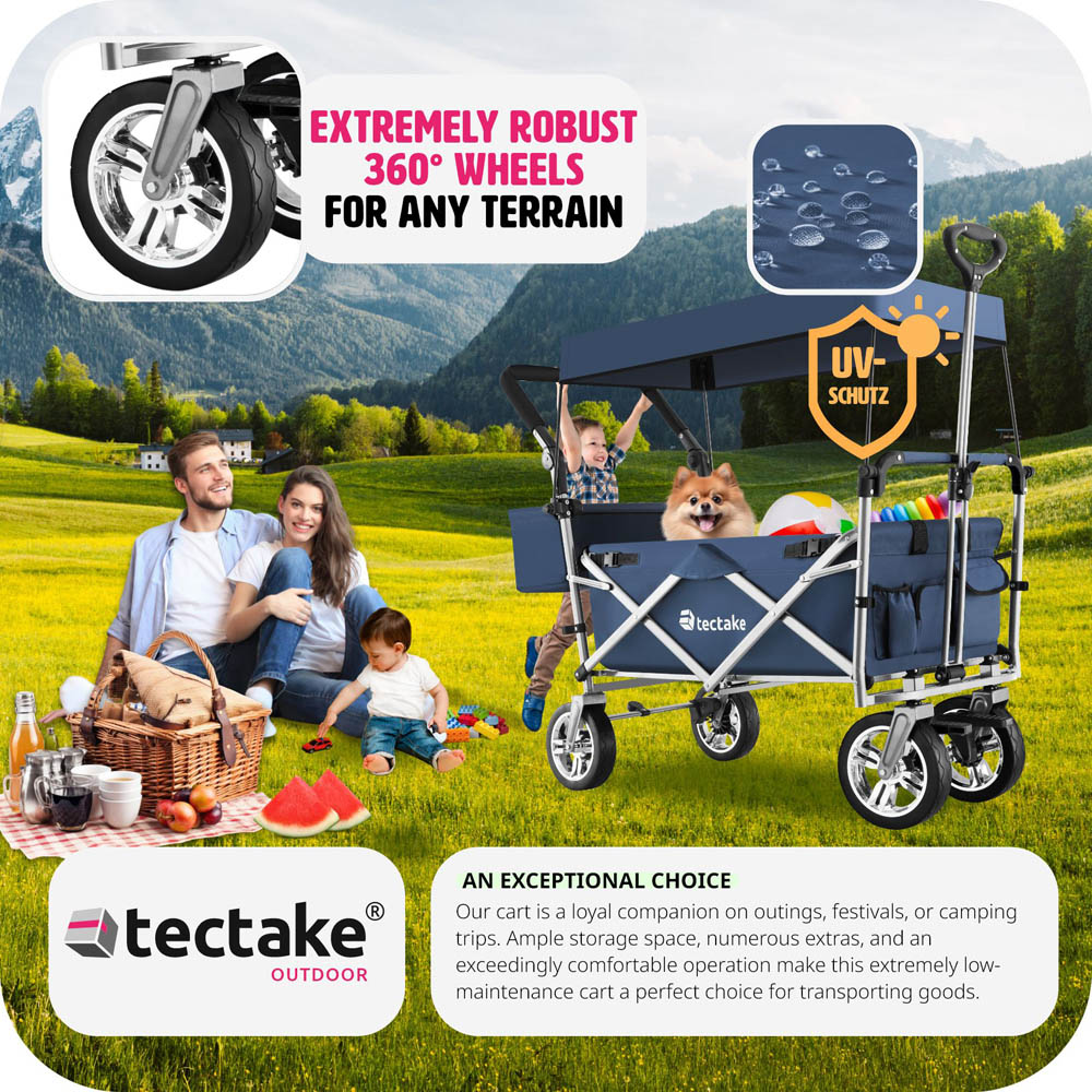 Discover the ultimate convenience with the innovative tectake Nico Blue Foldable Garden Trolley with Roof, designed to simplify your transport needs. With its smart folding mechanism, this sturdy cart is always ready for action, whether you're navigating your garden or embarking on family adventures. The strong steel frame is complemented by durable polyester fabric that resists water and dirt, ensuring long-lasting usability. Featuring a removable roof and spacious storage options, including multiple pockets and a large fold-out compartment, this handcart is as practical as it is versatile. The adjustable handle and smooth plastic wheels make manoeuvring effortless, ensuring that your next outing is both enjoyable and efficient. Experience unmatched utility with this fully assembled handcart trolley.