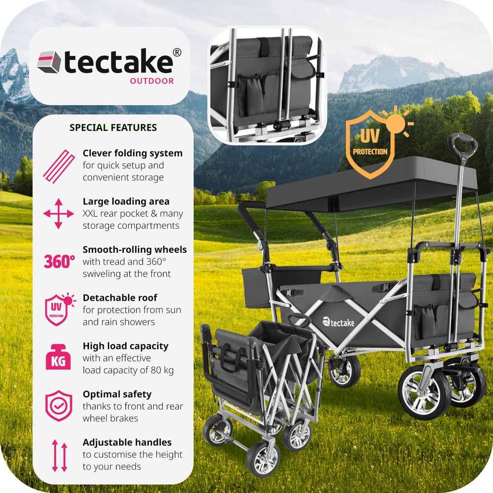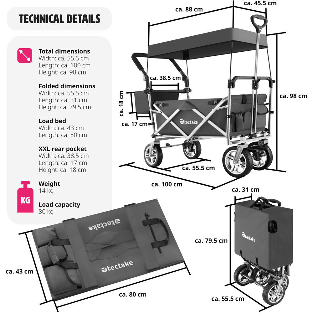 Lots of storage options and a removable roof are just some of the many highlights offered by this functional tectake Nico Grey Foldable Garden Trolley with Roof. The clever folding mechanism means this transport cart is always ready to go. The removable tongue, adjustable handle and smooth plastic wheels with grip make pulling and manoeuvring a breeze. The sturdy steel frame and durable polyester fabric guarantee good durability, resistance to water and dirt as well as a long life - for use around the home, garden, on adventurous family trips or at exciting festivals.