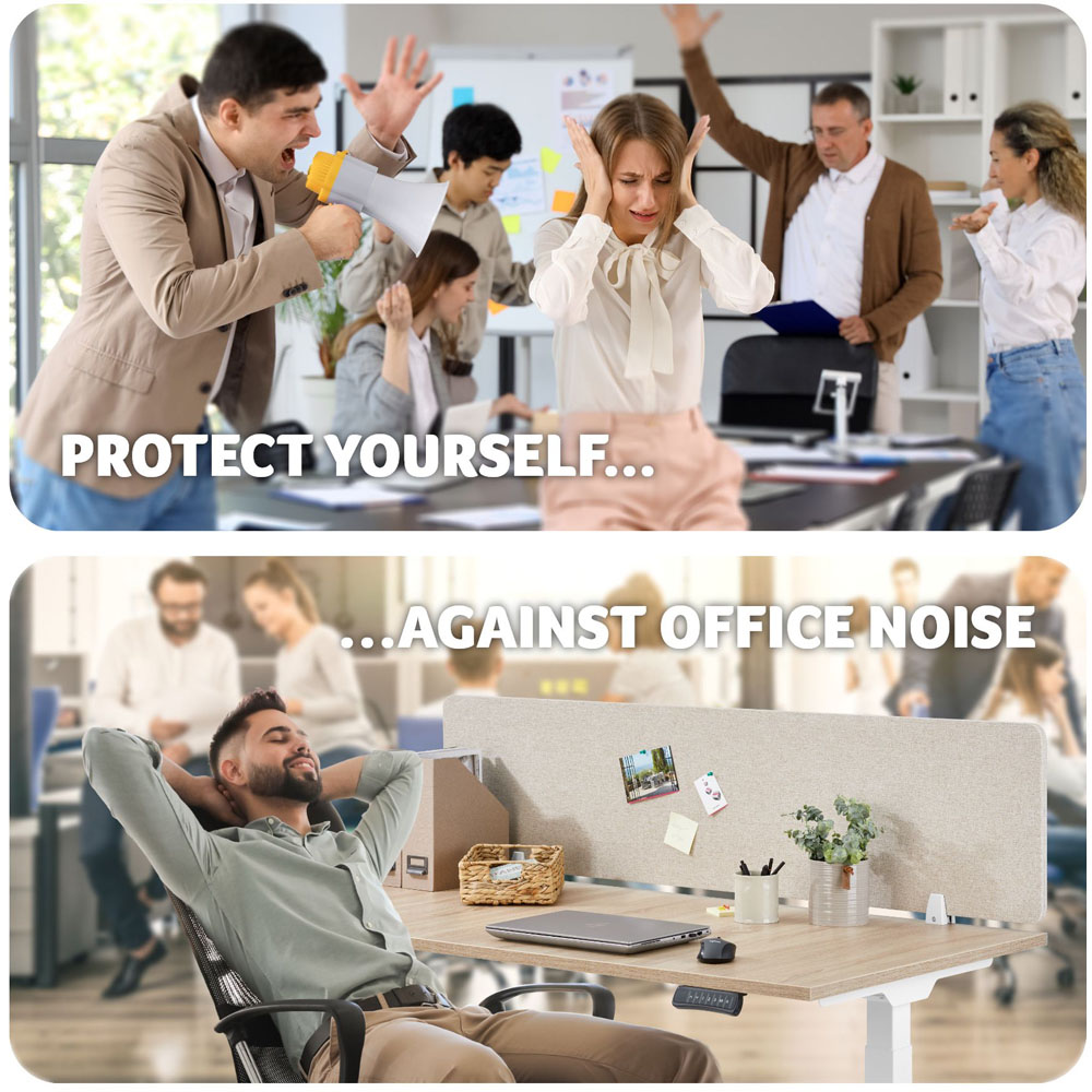 Enjoy a quieter office environment with more privacy, thanks to the noise-reducing desk divider Noisy by tectake. The core of the office desk divider is made of sound-absorbing, lightweight PET plastic, covered with durable and dirt-resistant fabric. The rounded edges give the colour-neutral privacy screen, which also doubles as a memo board, a modern and subtle look that easily blends into any setting. The installation with desk clamps is quick and drill-free, providing a secure hold.