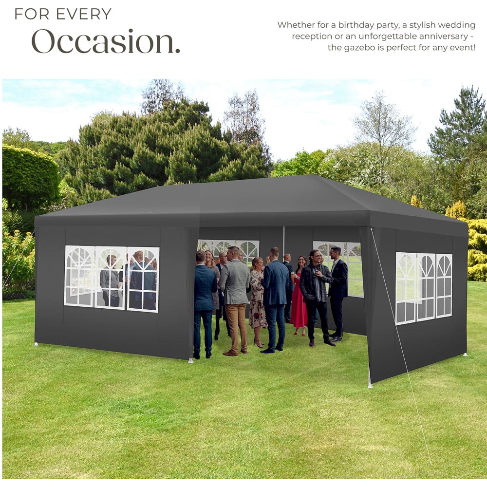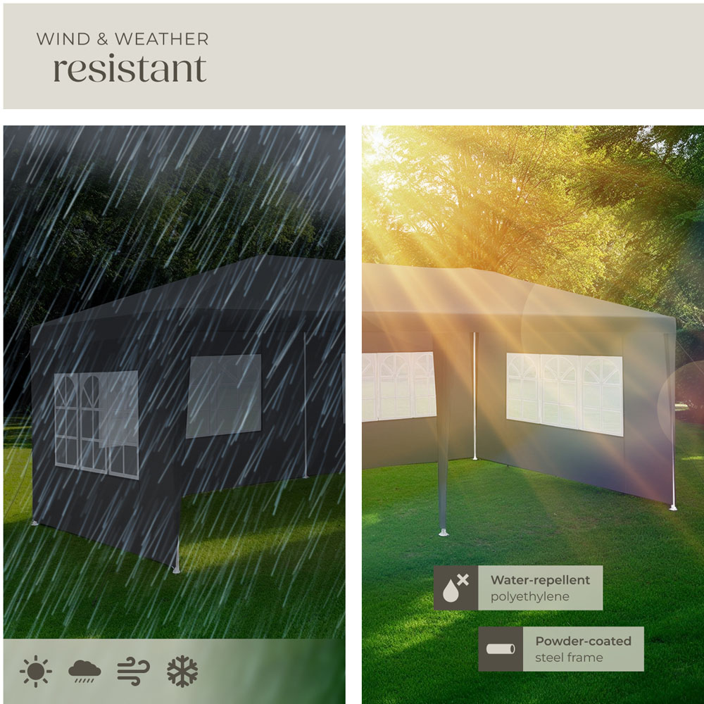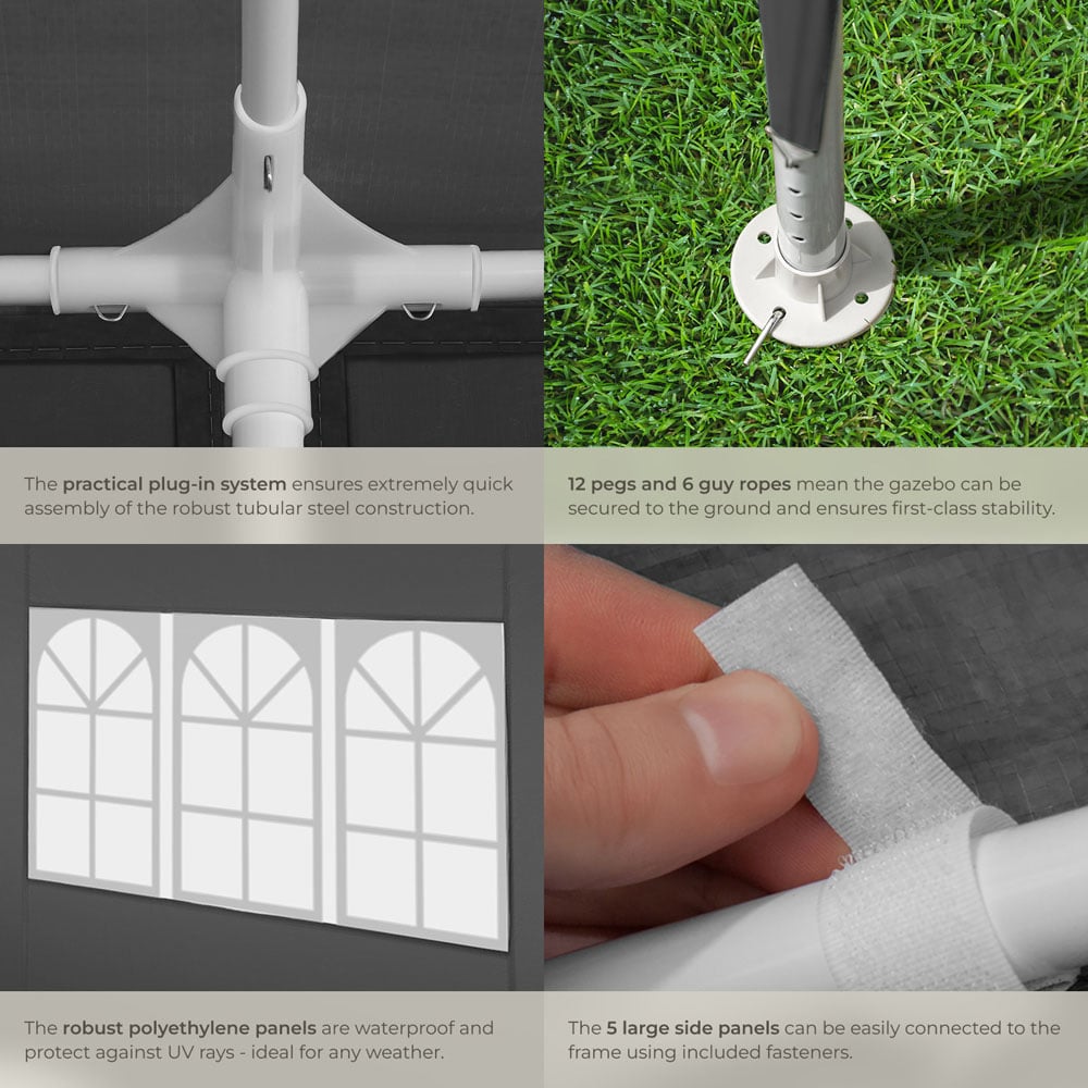 The gazebo Novara from tectake is the ideal choice for adding both style and functionality to your garden. Perfect for cosy hours with family or providing reliable shelter in changing weather, this garden pavilion combines timeless design with a solid build. A standout feature is the five flexible side panels; these sides can easily be attached or removed with hook and loop fasteners, allowing you to customise these gazebos based on your needs. Whether you prefer a roof canopy for sunny days or need more privacy and protection, the side walls give you full flexibility. The large windows create a light-filled and inviting atmosphere, making your outdoor space even more welcoming. Assembly is a breeze with the practical plug-in system, ensuring quick setup with minimal effort. The steel frame ensures stability, enhanced by six stable foot elements and tension-resistant guy ropes, giving you peace of mind during all types of weather. The Gazebo Novara offers an excellent solution for anyone seeking a versatile, weather-resistant gazebo with ease of use, durability, and style for their outdoor space.