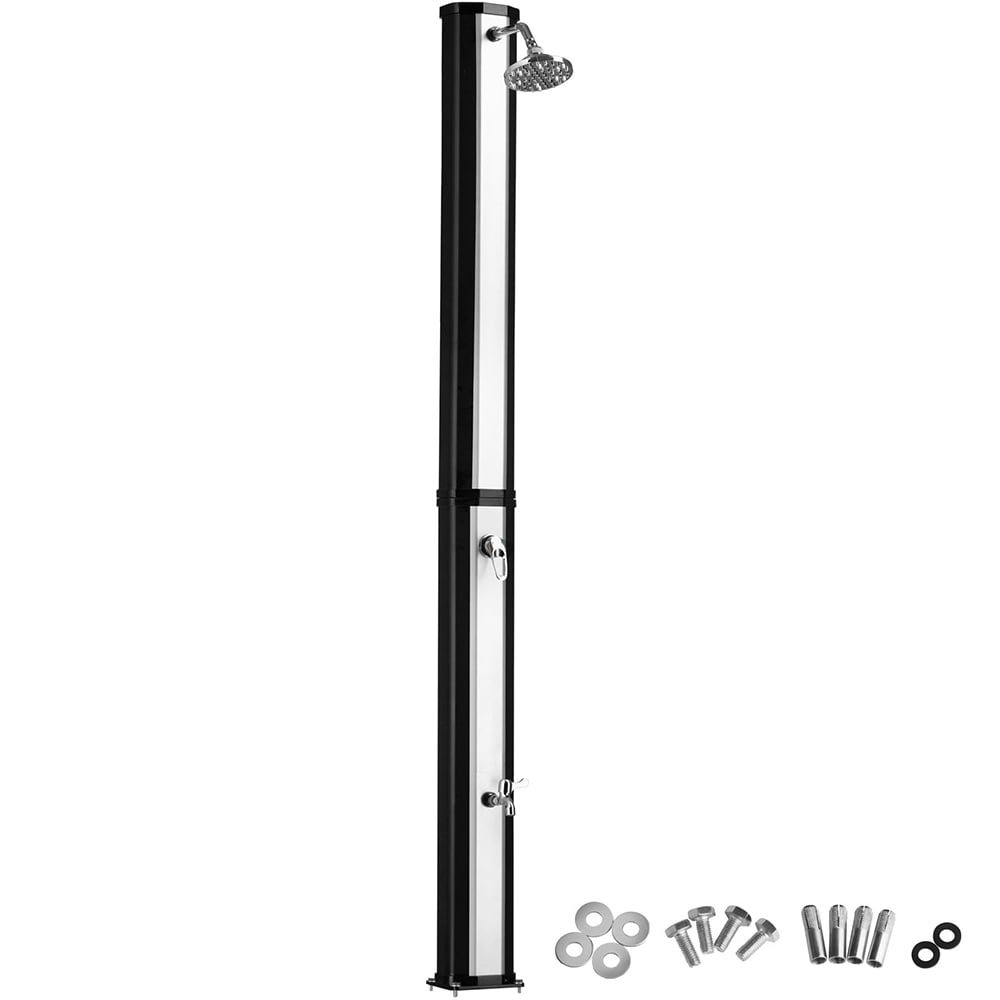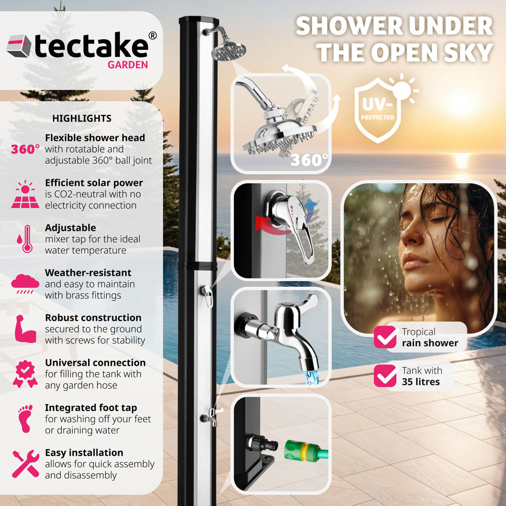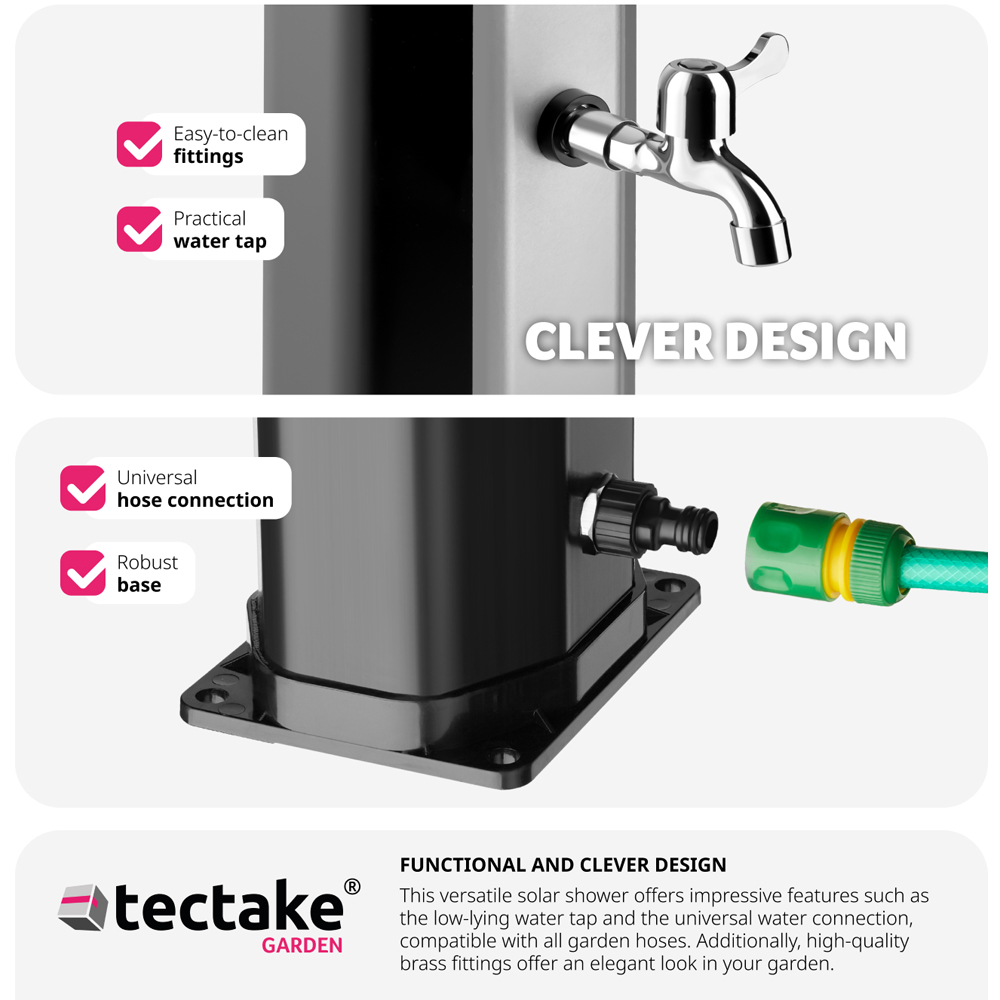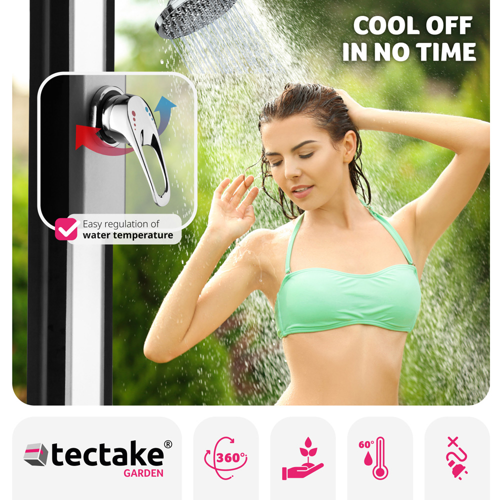 The comfortable yet elegant solar shower Ofanto from tectake is a refreshingly modern product to add to your camping accessories bag or outdoor space at home. The classy plastic material of the column efficiently stores the energy of the rays of the sun, heating the water stored in the tank, thus creating a portable hot shower wherever you are. For convenient use, the solar shower is equipped with a high pressure, swivelling rain shower head and an infinitely adjustable mixed water lever. The showers can be easily disassembled for simple storage when not in use. The products outlet tap in the lower area is ideal for cleaning feet or washing pets, making it a multiple purpose piece of equipment. Chic look, invigorating effect, the environmentally friendly solar shower Ofanto from tectake.