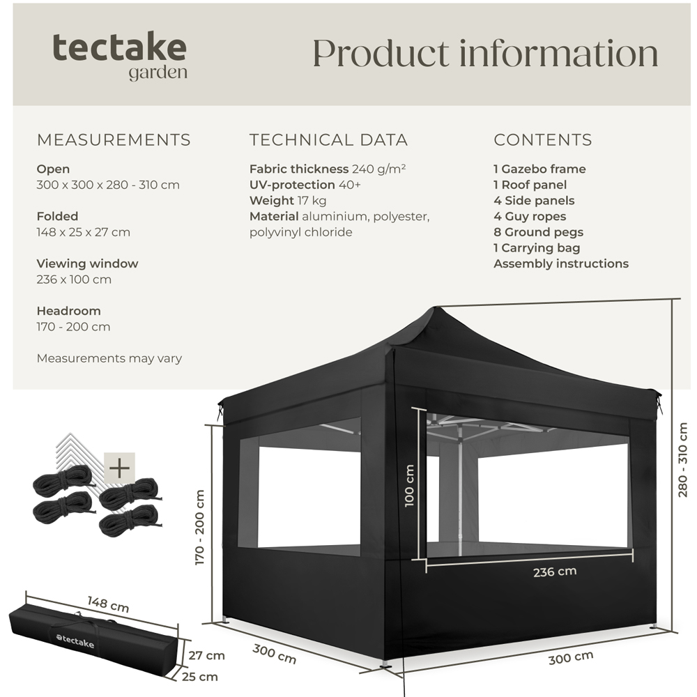 This portable, collapsible gazebo from tectake offers lots of space to keep you and your furniture protected from the elements. In just a few steps, this pop-up easy scissor frame with a simple click system is ready. The gazebo's roof and side curtains are secured to the robust frame with hooks and hook-and-loop fasteners. The height of the stainless and water-resistant pavilion can be varied as required. For easy transport and space-saving storage, this collapsible gazebo can be stored in the bag provided. The gazebo is perfect for outdoor use, whether it be for a family day at home in the garden or a day out down the beach with friends. These gazebos feature a lightweight aluminium frame with built-in canopy and removable sides. Light and easy to set up, it's perfect if you need privacy when outdoors. Easy to assemble. Easy to transport. Practical storage: the 3x3 metre collapsible gazebo from tectake.