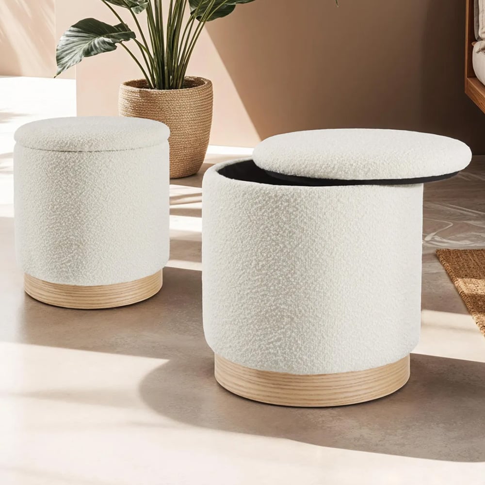 Enhance your living space with the Orchid Stools Set of 2, where elegance meets functionality in a beautifully crafted design. These padded footstools, enveloped in high-quality boucle fabric, offer a soft, cosy surface that is both sophisticated and easy to maintain. Each stool features a removable lid with foam padding for added comfort, revealing a generous storage space underneath—perfect for tucking away blankets, cushions, and other home essentials. The sturdy MDF frame and charming wood-look bases ensure stability and durability, making these stools ideal for any room in your home, from the living room to the office. Delivered pre-assembled, they provide an instant stylish and practical addition to your interior décor.
