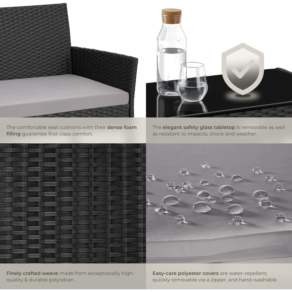 The comfortable Rattan garden set Palese from tectake offers space for up to four people with two chairs and a bench, inviting pure relaxation under the open sky with its soft seat cushions and high backrests. The carefully crafted polyrattan not only gives the seating group an elegant appearance but is also extremely resistant to weather. The sturdy steel frames with powder coating ensure maximum robustness, while the non-slip plastic feet guarantee absolute stability. The elegant coffee table perfectly complements the garden set and is ideal for placing drinks, snacks or books. The safety glass top in a tinted look is extremely durable and easy to clean. The polyester covers of the cushions are extremely easy to care for, water-repellent and can be effortlessly removed thanks to the practical zips and then hand-washed. This stylish collection includes chairs, a dining table, and a sofa, all in grey for a modern look. Perfect for relaxing or entertaining, these rattan sets fit seamlessly into any area, including corner sections for extra space. Shop now for the best in garden furniture, tables, and sofas.