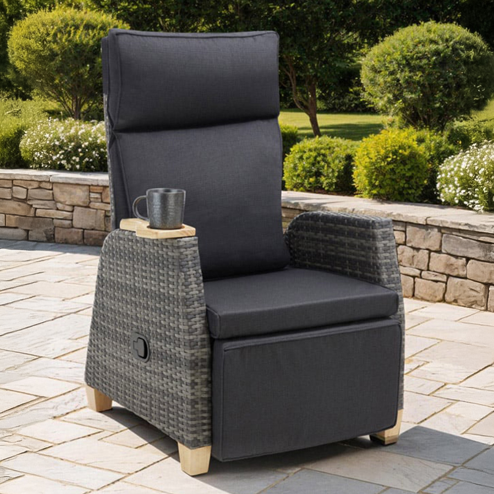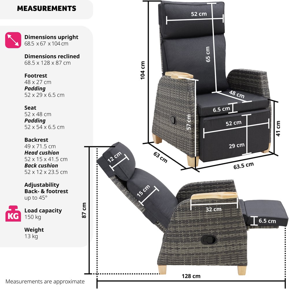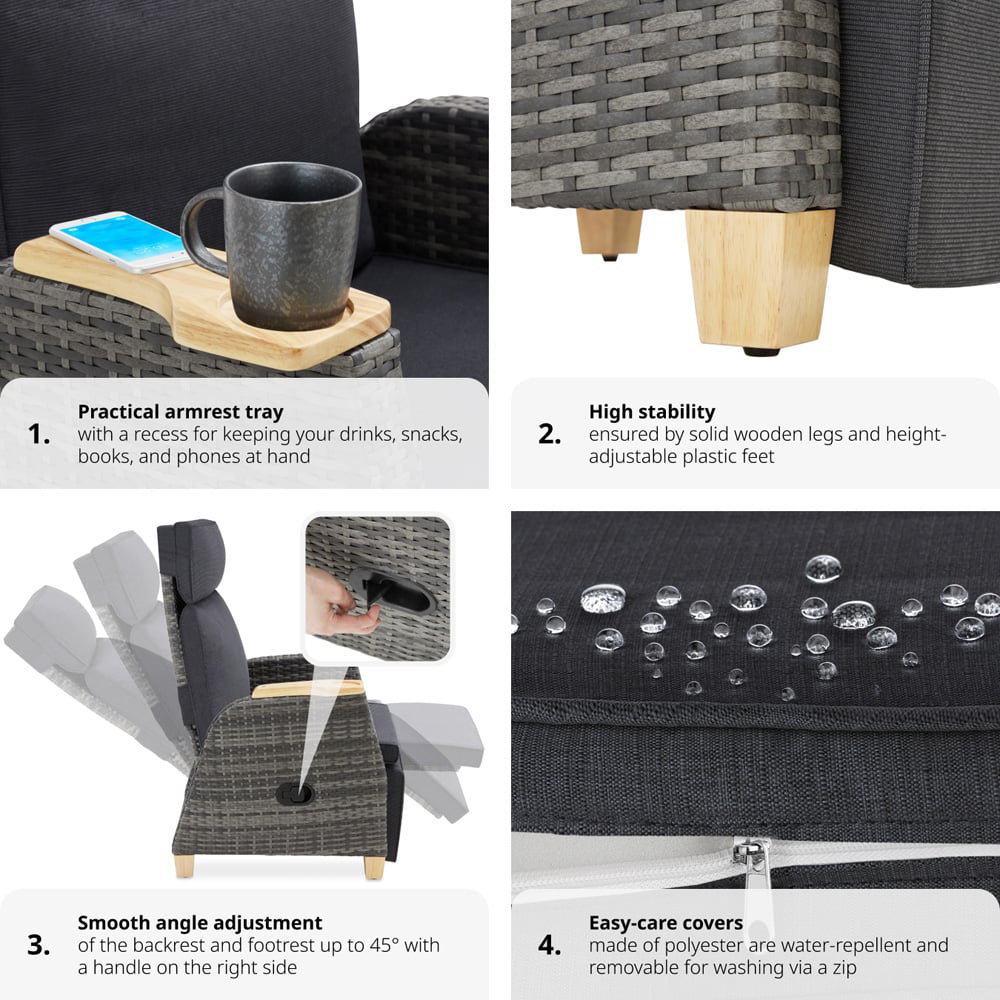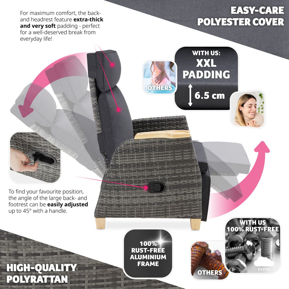 The Pescara reclining garden armchair from tectake is the king among rattan chairs and the perfect addition to your garden, balcony, or terrace. This luxurious outdoor chair combines elegance with luxurious comfort, making every moment spent outdoors a true delight. The thick seat and backrest padding is attached at several points to the chair, ensuring a first-class seating experience. The cushion sets easy-care polyester cover is water-repellent, removable, and washable. The rust-free aluminium frame and the high-quality woven polyrattan make the garden chair weatherproof, highly resilient, and extremely durable. In addition, assembly of the furniture consists of just four steps and is therefore completed in no time. Thanks to continuously adjustable screw feet, any unevenness in the ground can be easily compensated for, ensuring the reclining balcony chair always has a stable stance. With the stepless adjustability of the backrest and footrest, you are guaranteed to find the ideal sitting or reclining position on your personal sofa. The garden armchair also features an attachable tray on the armrest which provides a recess for safely placing a drink, your smartphone and a good book, so you have everything you need within reach. Give your outdoor area a luxurious space to relax and unwind with the Pescara reclining garden armchair from tectake – a true oasis of relaxation in a sophisticated design.