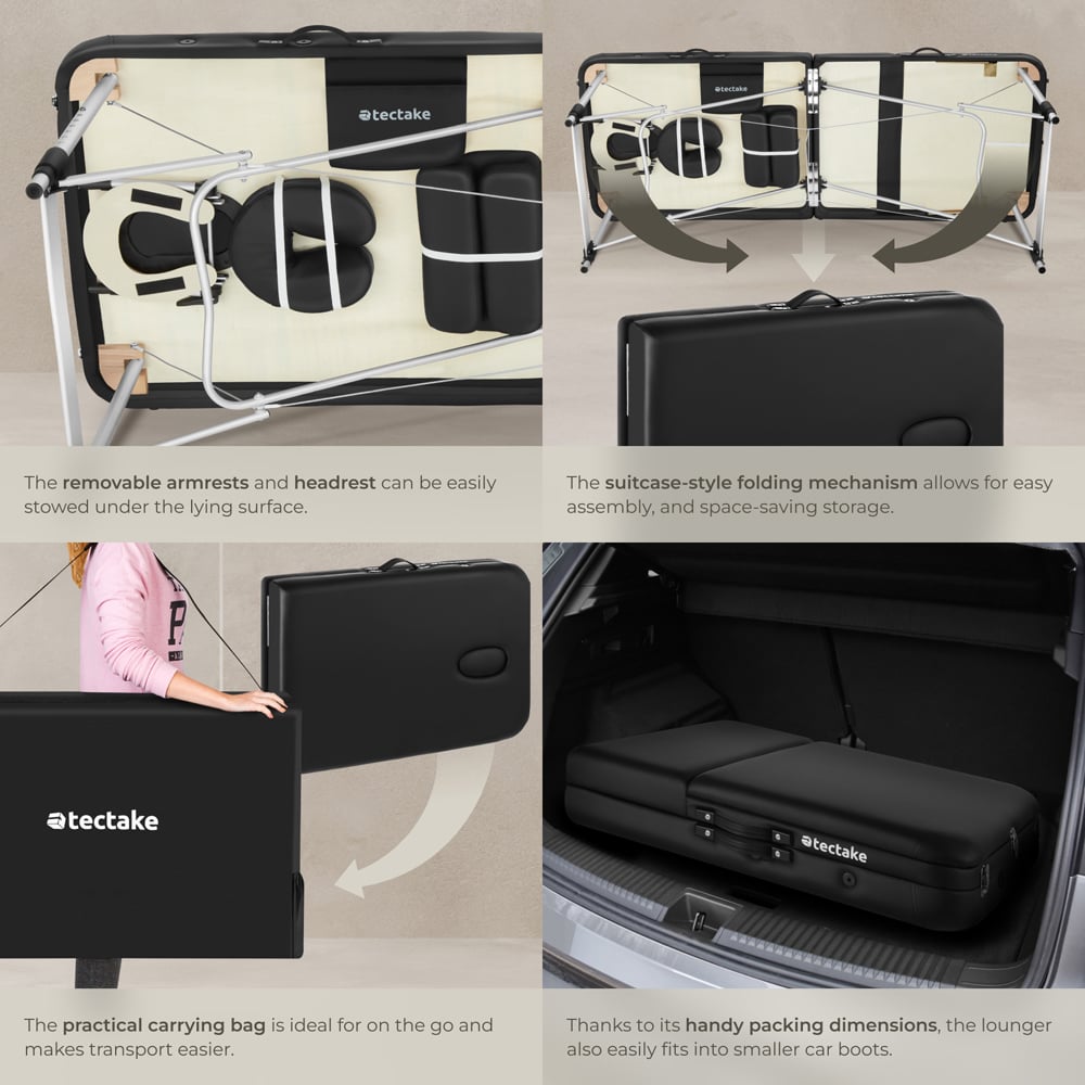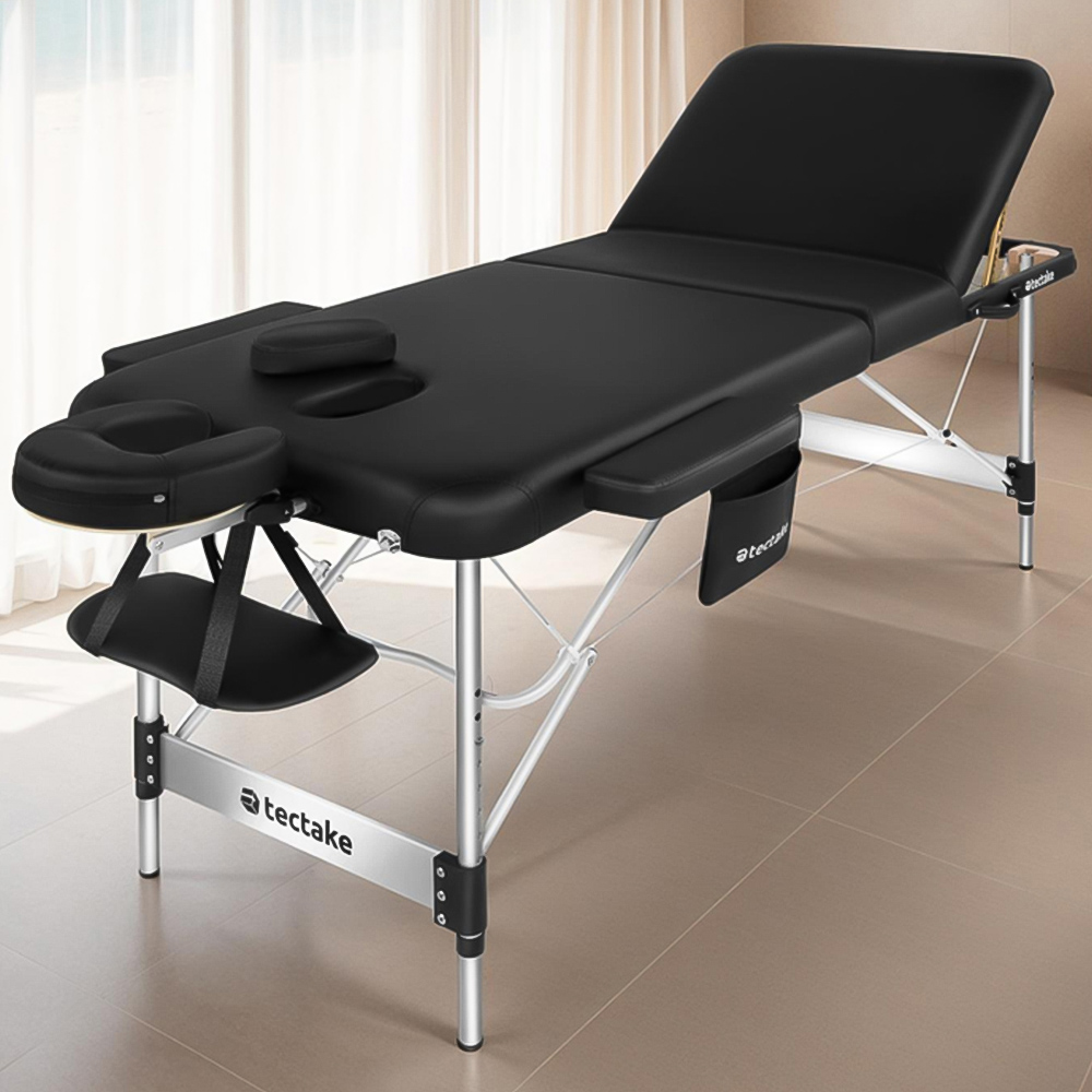 Experience the Tectake Phuket 3 Zone Black Massage Table. With 5 cm thick fine cell foam padding, it offers unparalleled comfort. The height-adjustable aluminium frame is stable and lightweight, perfect for mobile use. The adjustable footrest, removable headrest, detachable face cushion, and attachable armrests provide flexibility. All elements can be compactly attached to the underside of the table for easy storage. The package includes 15 disposable face cradle covers, a small side pocket for accessories, and a carry bag for transport. Ideal for both personal and commercial use, this high-quality massage table ensures an optimal experience for both clients and therapists, combining comfort, hygiene, and flexibility.