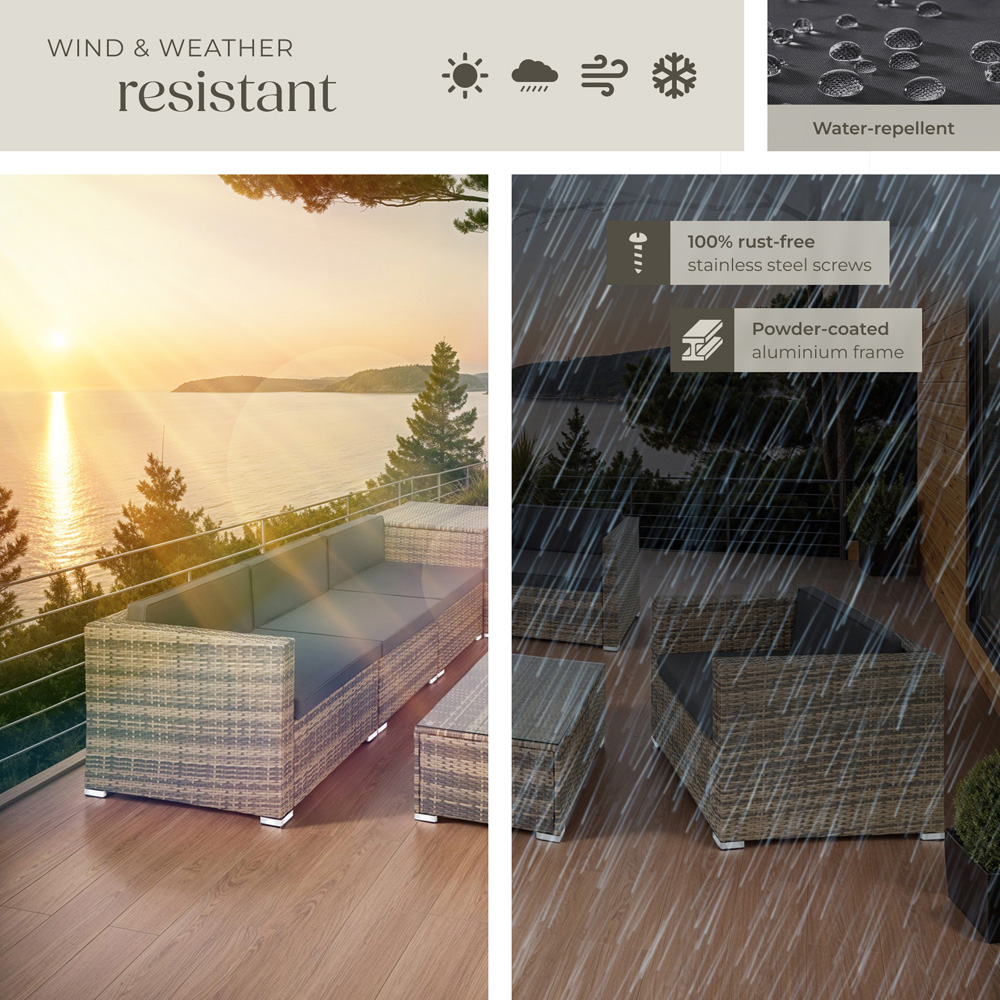 Upgrade your outdoor living space with the Garden Furniture Pisa, a standout piece that merges style, functionality, and comfort. Perfect for both intimate and social gatherings, this rattan lounge set is designed to cater to all your garden relaxation needs. Experience Unmatched Comfort and Style The Garden Furniture Pisa boasts an inviting and attractive design, making it a centrepiece in any homes outdoor space. Crafted from high-quality, UV-resistant Polyrattan, this set is built to withstand the elements while maintaining its pristine appearance. The set includes plush, 8 cm thick seat and back cushions that are both water-repellent and easy to clean, ensuring your comfort regardless of the weather. Robust and Practical Design Featuring a durable steel frame, the Garden Furniture Pisa promises long-lasting stability and support. The set includes a versatile table with a removable glass top, offering a perfect spot for your beverages, magazines, or even as a footrest. This thoughtful addition ensures your outdoor dining experience is both stylish and convenient. Innovative Storage Solutions One of the standout features of the Garden Furniture Pisa is its spacious storage box equipped with a user-friendly lift mechanism. This practical component provides ample space for storing all your cushions and other accessories, keeping your garden tidy and organized. Modular and Functional Layout The modular design of the Garden Furniture Pisa allows you to customize your seating arrangement to suit any occasion. With easy-to-use connector clips included, you can securely join the components or effortlessly reconfigure them to fit your space and needs. Whether you're hosting a garden party or enjoying a quiet evening, this versatile set adapts to your lifestyle. Effortless Maintenance is a breeze with the Garden Furniture Pisa. The sturdy Polyrattan material and removable glass table top ensure hassle-free cleaning. Additionally, the water-repellent cushions are designed to repel dirt and water, meaning you spend less time worrying about upkeep and more time enjoying your garden. Enhance Your Outdoor Space with Garden Furniture Pisa Turn your garden into a luxurious retreat with the Garden Furniture Pisa. Combining durable materials, a chic design, and exceptional comfort, this rattan lounge set is the perfect addition to any outdoor setting. Whether your lounging solo or entertaining guests, the Garden Furniture Pisa ensures that every moment spent in your garden is a delight. Invest in the Garden Furniture Pisa today and transform your garden into a haven of relaxation and style.