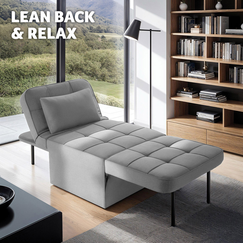 Discover the ultimate lounger chair Ponto by tectake your personal retreat for versatile comfort! The chairs super-thick, high-density foam padding, the cosy woven fabric and the soft headrest ensure maximum comfort. Thanks to the innovative 4 in 1 function and the adjustable backrest, you will always find the ideal sitting or lying position. Whether as an armchair, a space-saving stool, a practical single guest bed or a comfortable lounger “ this all-rounder product transforms into the piece of furniture you need to relax in no time thanks to the folding function. The robust powder-coated steel frame impresses with an extremely high load capacity and ensures reliable stability in every position. The floor-friendly felt pad accessories on the frame and the non-slip plastic feet at the end of the fold-out legs also guarantee absolute stability on any surface. Removable and washable covers make cleaning the versatile piece of home furniture extremely easy. Whether you want to relax, read or sleep “ use the durable lounger chair Ponto by tectake which will adapt to your wants and needs!
