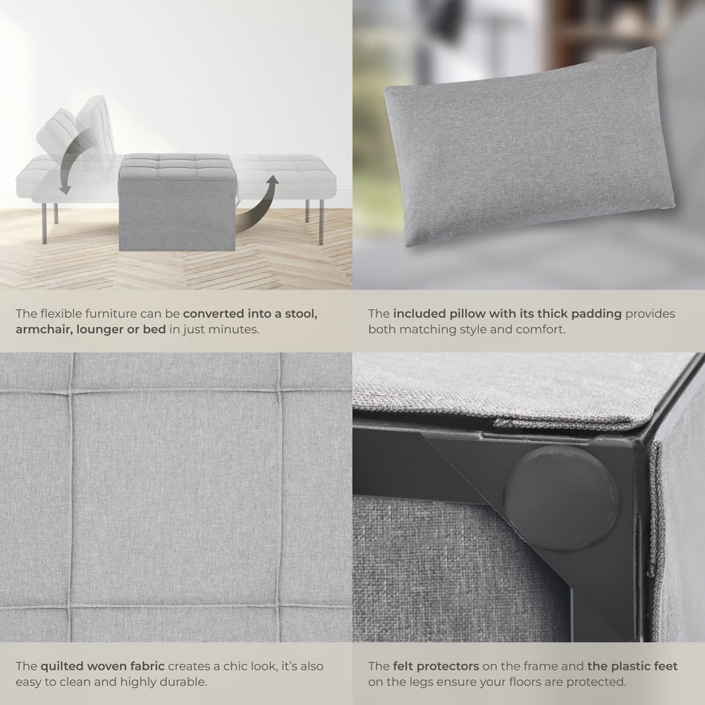Discover the ultimate furniture piece for your home with the tectake Ponto 4 in 1 Grey Lounger Chair. This versatile chair offers a blend of comfort and functionality, featuring super-thick, high-density foam padding and soft woven fabric for maximum relaxation. It's unique 4 in 1 design makes it perfect as a sofa, seat, bed or lounge. Easily adjust the backrest to find the ideal sitting or lying position, whether you need a comfortable lounger, a single guest bed, or a space-saving single seater stool. Made with a robust powder-coated steel frame, the Ponto lounger guarantees reliable stability in any position. The non-slip plastic feet and felt pads on the frame ensure the chair remains secure on any surface, while the removable, washable covers make it easy to maintain. Compared with other single purpose sofas or beds this versatile piece of home furniture is the perfect addition to any living room, bedroom, or corner room. Whether you want a grey sofa, an extra bed, or just a cosy spot to relax, the Ponto lounger is your ideal choice.