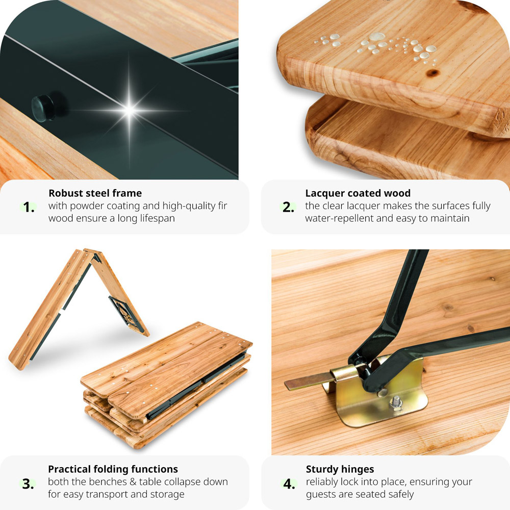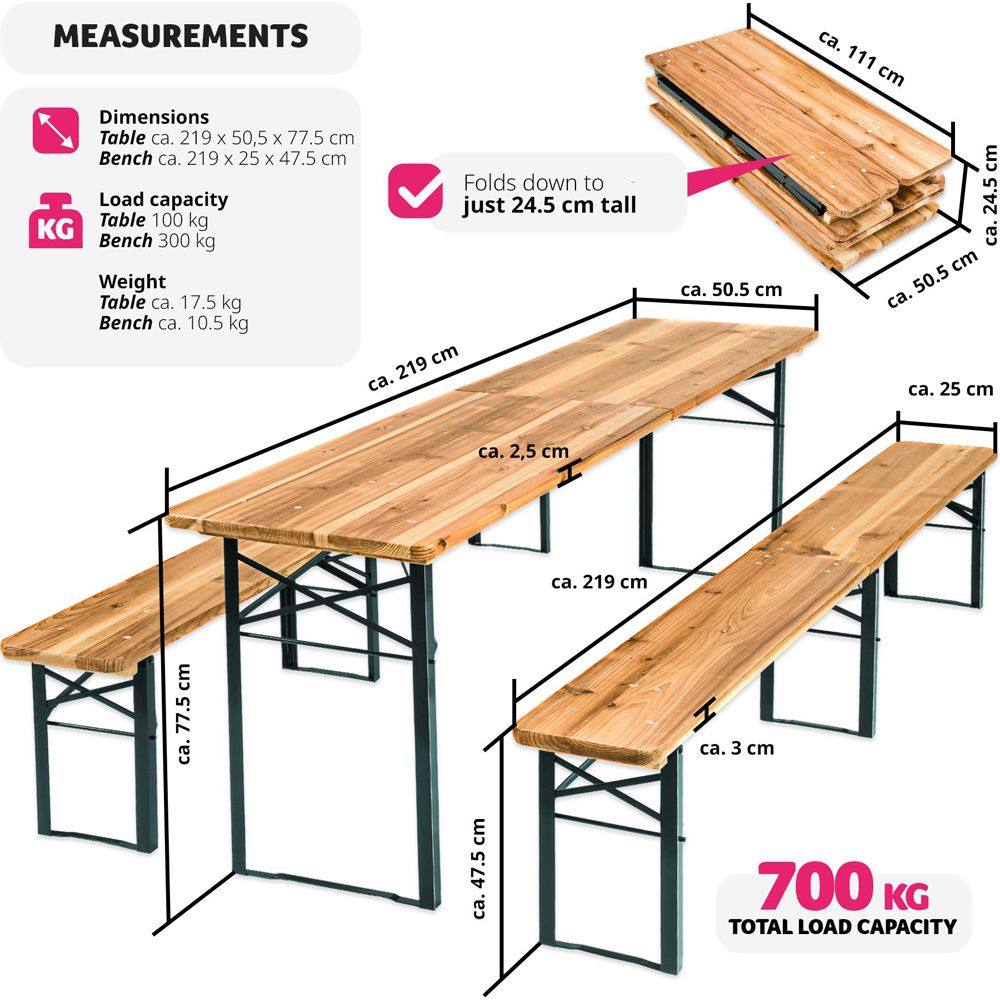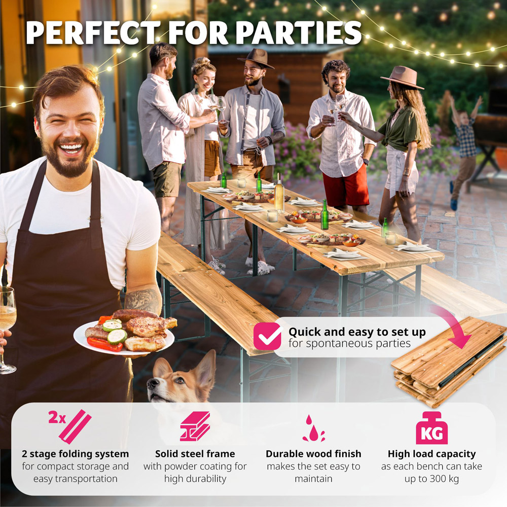 Whether birthdays, club parties or other events - the tectake Ralf Brown Dining Table and Bench Set invites you to celebrate together in any case. The set can be set up and dismantled quickly and is easy to transport and stow away. You will impress all the guests with this bench and table set from tectake.