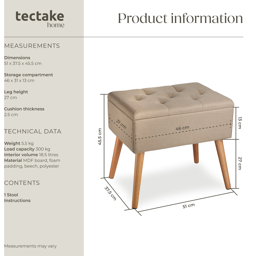 Set a stylish footstool in your apartment with the inviting Tectake Ranya Sand Upholstered Linen Bench. Visually, the stable piece of furniture scores high with its harmonious contrast between the subtle linen cover and the feet made of solid beech wood. Thanks to the stools spacious compartment under the lid, the extremely resilient construction also impresses thanks to its ability to store a range of home items. In the hallway, living room, bedroom or next to the back garden door, the padded stool is ideal for putting on shoes and for storing hats, gloves, scarves and other outdoor garments. The benches wooden legs and strong construction mean it is capable of holding a high load capacity, ideal for sitting and storage. Add the versatile Ranya bench from tectake to your home.