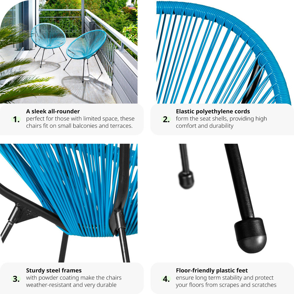 A comfortable sitting experience blends with an inviting retro look with these moon chairs in an oval Acapulco style from tectake. The subtle, elastic-plastic strands adapt perfectly to the shape of anybody. With its simple elegance, the curved, filigree design will make a good impression both outdoors and within your home. The chairs are standout pieces of furniture which will look great in any room. Alongside a table, the chairs can be used to create a relaxed dining experience in your conservatory or on your patio. In the sunny corner of an office or bedroom, they can be used as relaxing armchairs to become emersed in your favourite book. The powder-coated steel frame and the hard-wearing Polyethylene seat give these lightweight chairs a high degree of stability and comfort. Order yourself a pair of new statement chairs from tectake today.