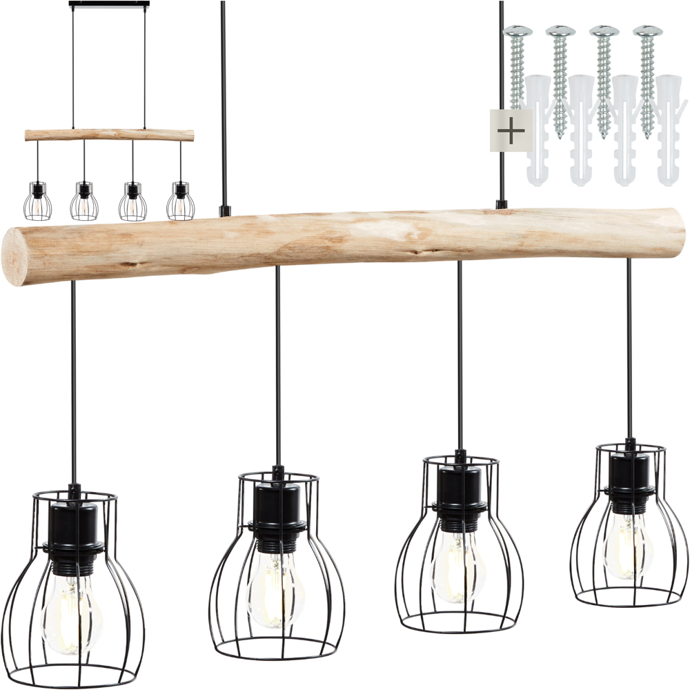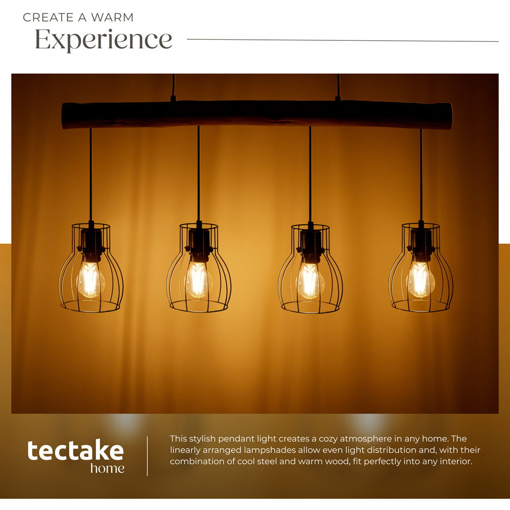 Illuminate your space with the rustic charm and modern flair of the Woody pendant light from tectake. This striking fixture features a natural wooden beam paired with minimalist black grid lampshades, offering a warm ambience ideal for dining areas and kitchen counters. With its durable powder-coated steel and solid wood construction, this pendant light ensures long-lasting quality and resistance to bumps, all while providing even illumination with its four E27 bulb capacity. Adjust the height with the flexible black cable to suit any room, and enjoy a seamless installation process with included mounting materials.