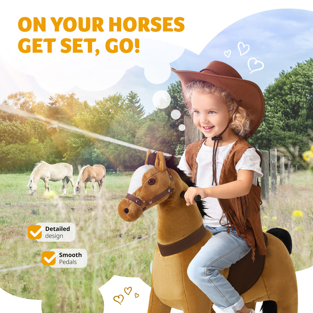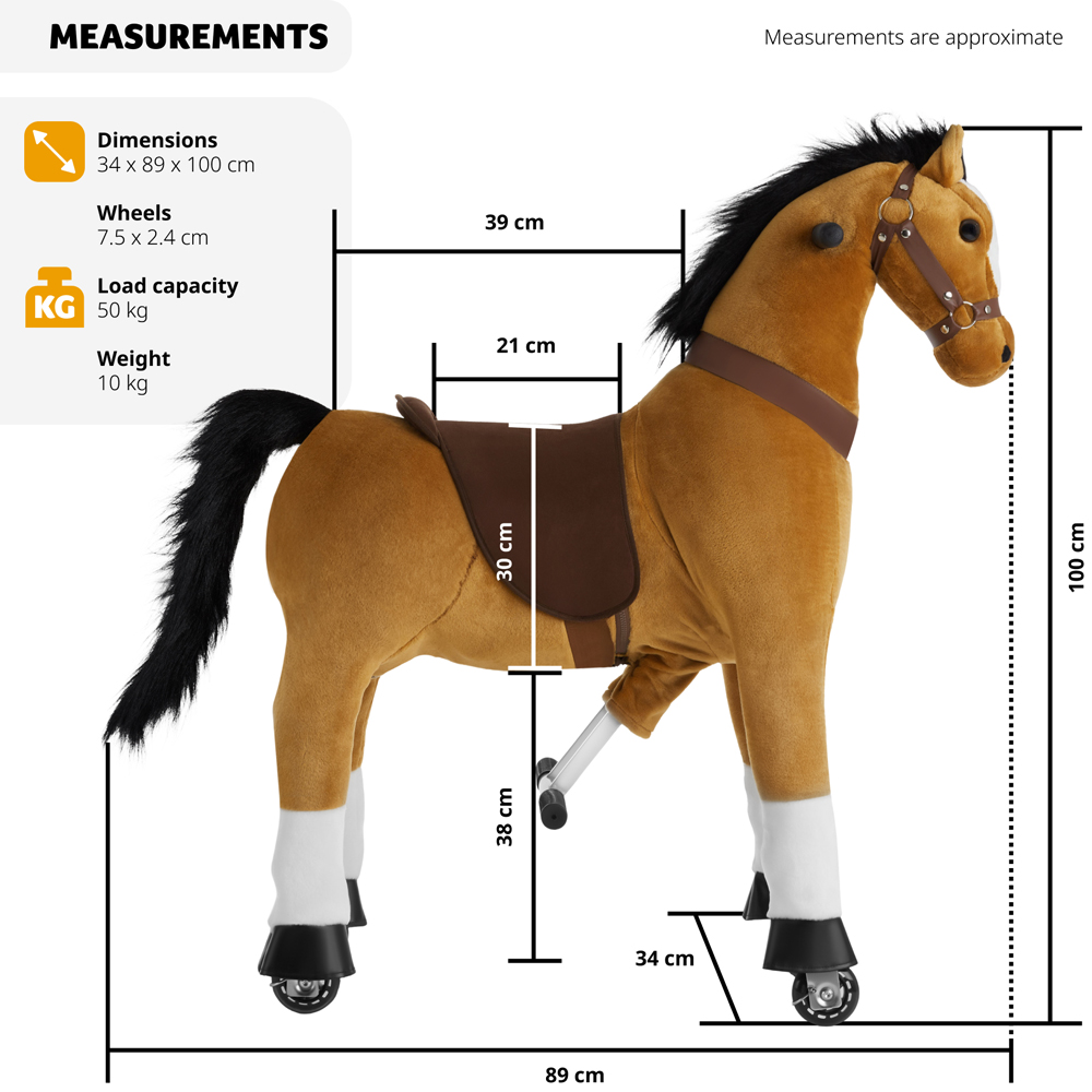 This rocking horse from tectake that makes little riders' hearts beat faster! With its detailed design, including mane, tail, saddle and bridle, these plush horse toys will spark your children's imagination. These rocking horses are the perfect companions for exciting adventures out on the range, both in the home and outdoors. More than just traditional rocking horses, these are fully mobile toys. By imitating a horse's natural riding movements, your child will be propelled forward, improving their coordination skills and motor development. Available in different sizes and load capacities, our new rocking horse on wheels is the perfect toy for all riding enthusiasts from 3 to 12 years old. Whether your child gallops his horse proudly through the living room or takes a spin outdoors, these rocking horses from tectake ensure years of playful fun.