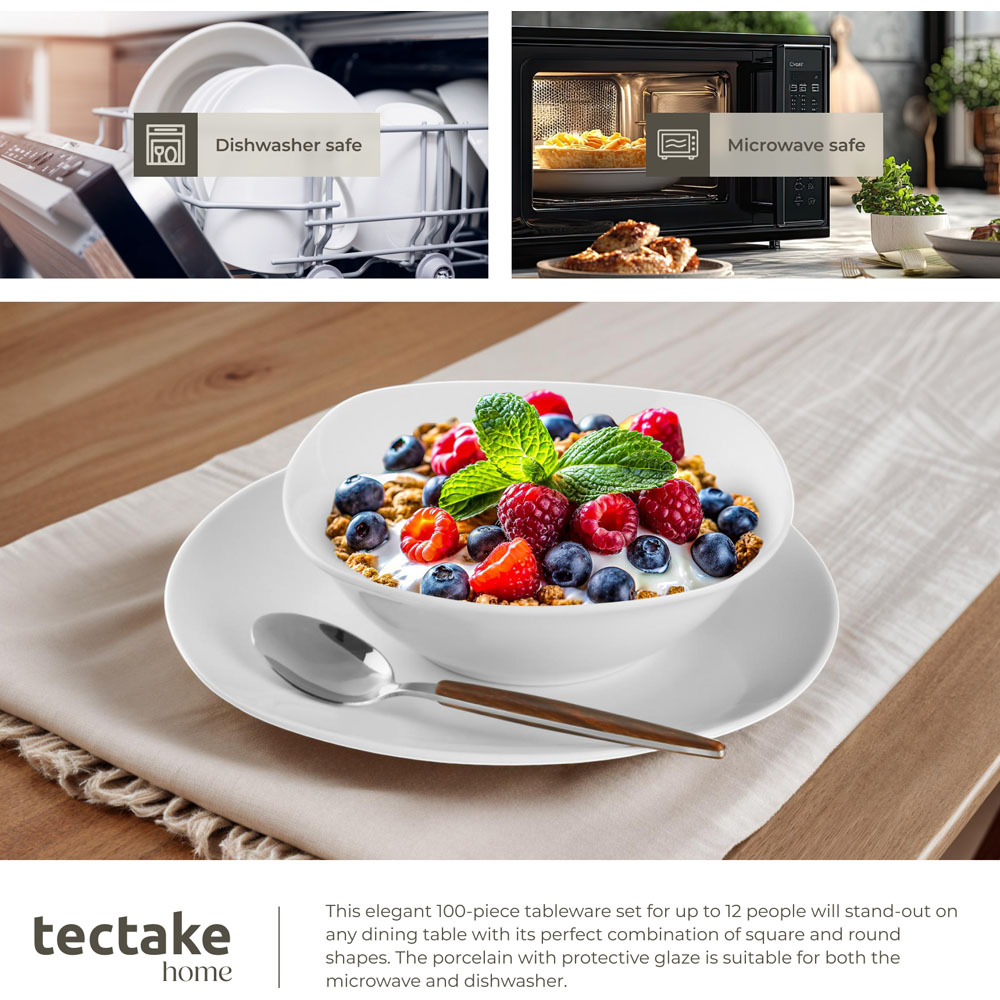 Elevate every meal with the Salerno dinner set from tectake, a luxurious collection that combines elegance with practicality. This 100-piece porcelain dinnerware set is designed to cater to up to 12 people, making it an ideal choice for both intimate family dinners and larger gatherings. Crafted from scratch-resistant porcelain with a protective glaze, it ensures durability and a timeless appeal that enhances your dining table setup. The set is not only visually appealing but also caters to modern needs, being both microwave and dishwasher-safe. It’s perfect for those who appreciate a blend of style and functionality in their kitchenware, making every dining occasion a memorable one.