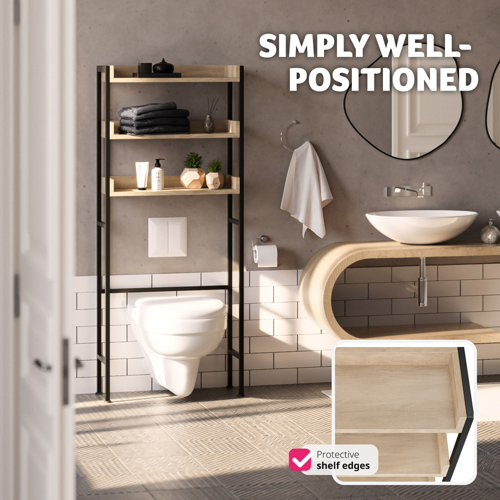Transform wasted bathroom corners into organised havens with this tall freestanding organiser in a striking industrial wood effect, featuring three spacious tiers in oak Sonoma and cool steel for a modern touch. Cleverly designed to fit over laundry baskets or furniture, it keeps bottles, soaps and accessories neatly stored, freeing up valuable floor and bath space. Individually adjustable feet and an anti-tilt function promise stability while the three-sided edging on each shelf keeps everything secure, making it a smart choice for any UK bathroom.