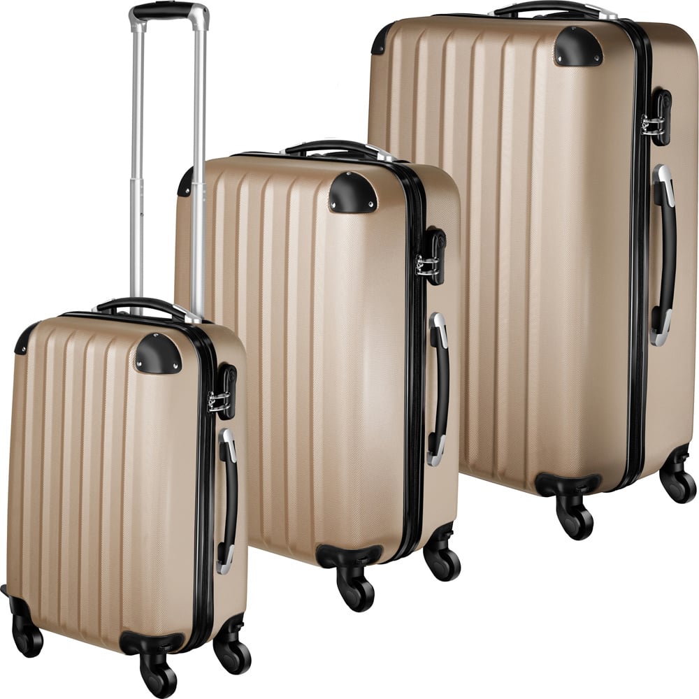 The Tectake ultra-light suitcase set in a top design will be your perfect travel companion. The bags high-end workmanship coupled with various packing options thanks to the straps and compartments as well as the practical extra net compartment leave no want unfulfilled. Every bag features aluminium, telescopic trolley handles and 4 360° rubber wheels as well as handles on 2 sides ensure great stability when travelling. The ABS plastic hard shell has a beautiful, metallic surface and is very robust against shocks and impacts, for example on the conveyor belt or during check-in. The sets front edges are reinforced with special fittings which help to keep your luggage safe. The suitcase sets high volume capacity makes it ideally suited for all types of travel. Whether it's on a holiday, short break, business or world trip, this 3 piece suitcase set from Tectake will keep your belongings safe and secure.
