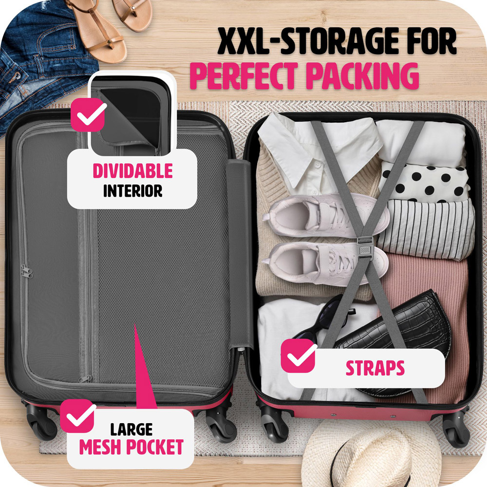 Your new perfect travel companion - whether it's on a holiday, short break, business trip or travelling the world. Our ultra light luggage suitcases set shines with plenty of packing options. None of your wishes remain unfulfilled thanks to the cross strap and a partition wall with additional mesh compartment. The 2x height-adjustable aluminium telescopic handle and 4 x 360° wheels as well as the ergonomic handles on two sides make your travels a lot easier. Another advantage for you: Thanks to the integrated double zipper, the volume of the suitcase can be flexibly increased by up to 20%. The ABS plastic hard shell is very robust and protects the contents against impacts and shocks, for example on the conveyor belt or during check-in.