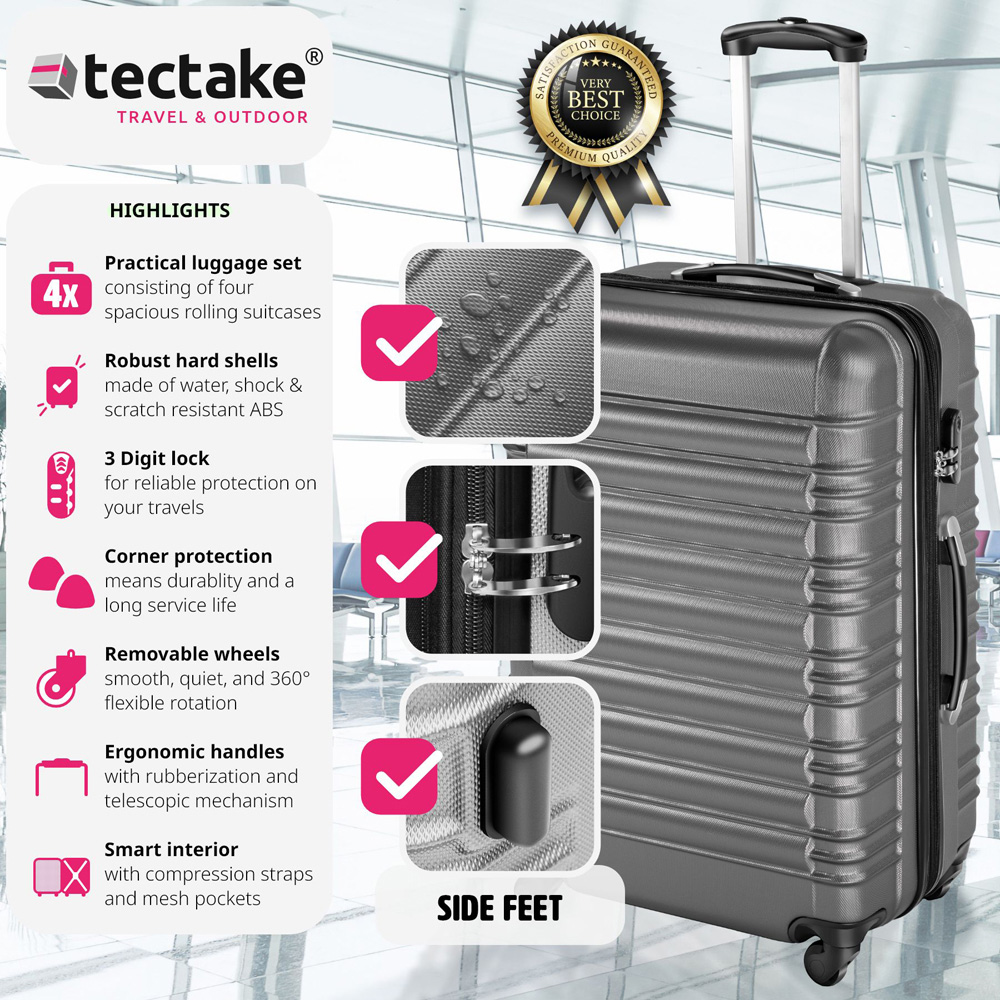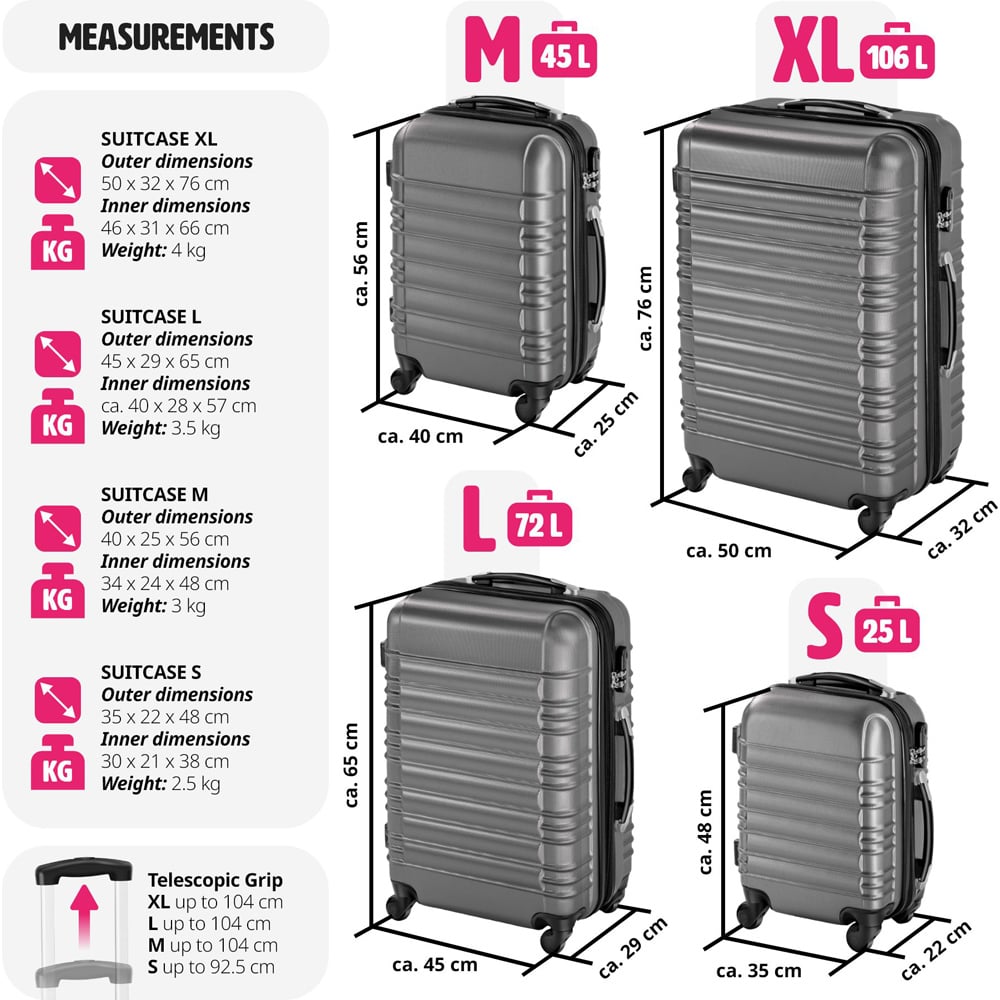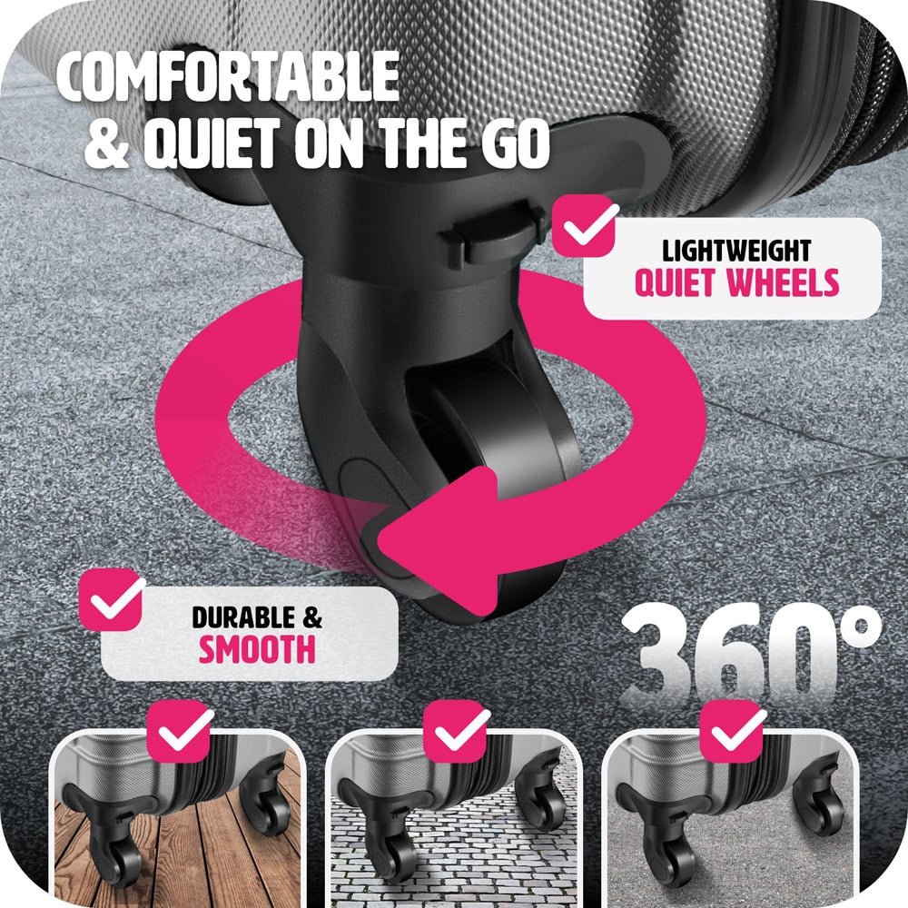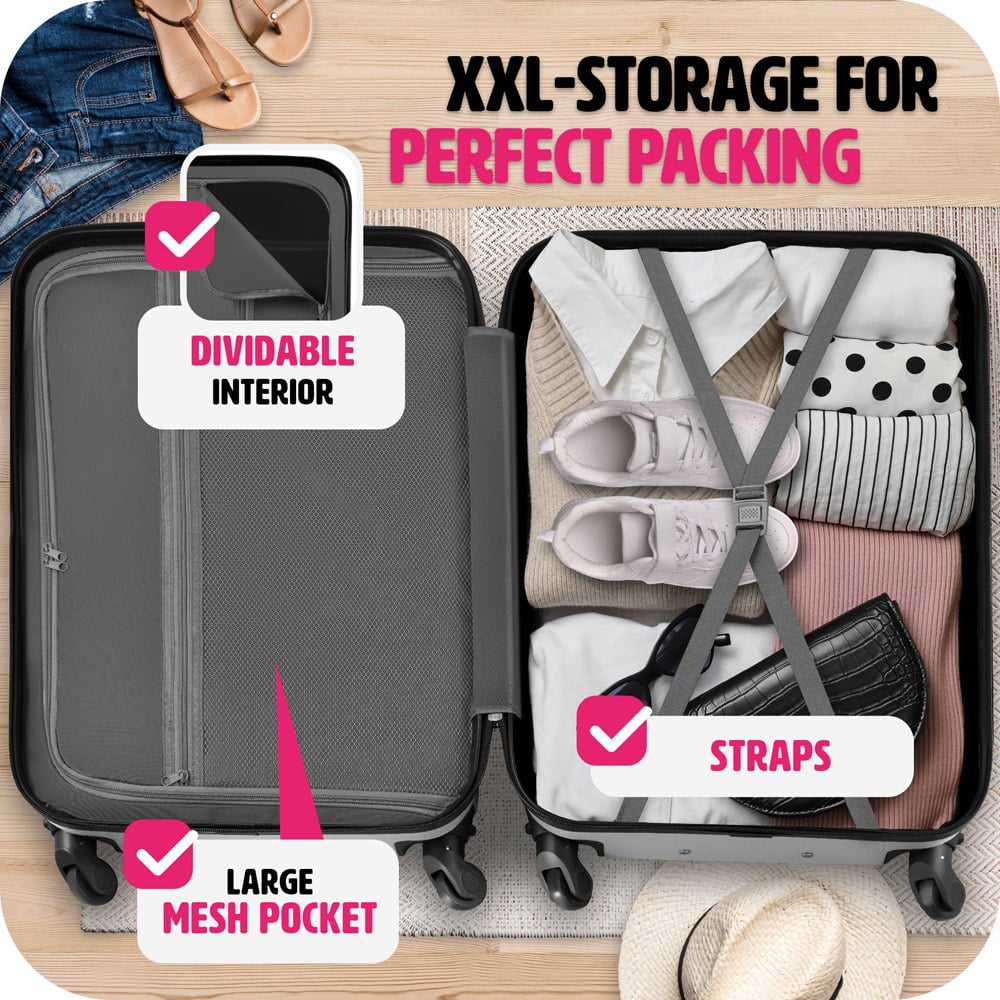 Your new perfect travel companion - whether it's on a holiday, short break, business trip or travelling the world. Our ultra light luggage suitcases set shines with plenty of packing options. None of your wishes remain unfulfilled thanks to the cross strap and a partition wall with additional mesh compartment. The 2x height-adjustable aluminium telescopic handle and 4 x 360° wheels as well as the ergonomic handles on two sides make your travels a lot easier. Another advantage for you: Thanks to the integrated double zipper, the volume of the suitcase can be flexibly increased by up to 20%. The ABS plastic hard shell is very robust and protects the contents against impacts and shocks, for example on the conveyor belt or during check-in.