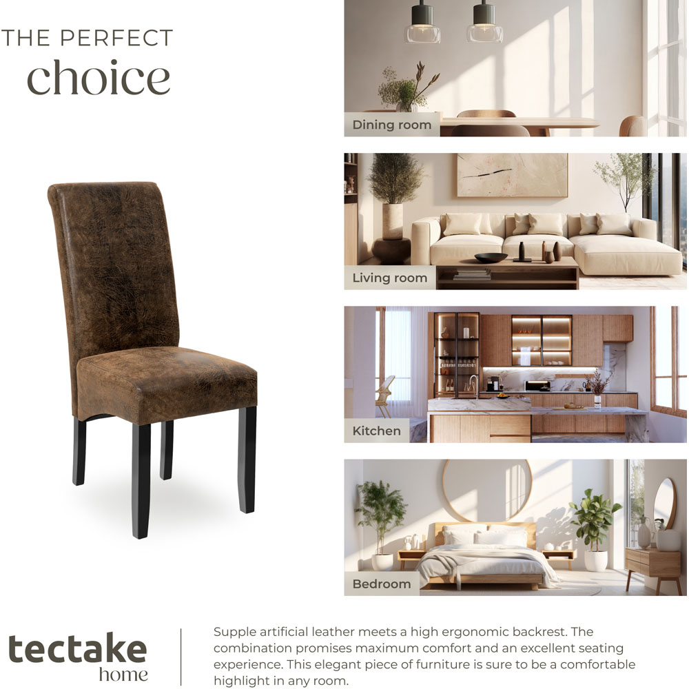 These elegant dining room chairs from tectake are a real eye catcher. The dining chairs have an ergonomic shape for the best comfort, even when seated for a long period of time. The chair legs are made of solid hardwood, with a high-quality gloss finish, making the furniture stable and strong. The chair cover is made of easy to clean, synthetic leather. This dining chair would look great around the dining room or kitchen table as the elegant, attractive design provides not only comfort but also durability. The dining chairs are quick and easy to assemble. Get these high qualitiy dining room chairs from tectake for your home.