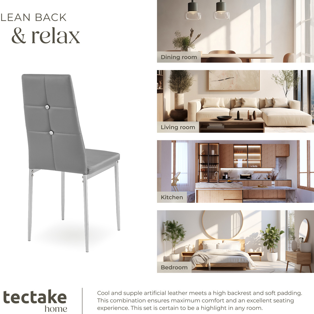 Make a stylish statement in your kitchen or living room with this set of eight dining room chairs from tectake. This chair set combines a chic design with practicality, which will complement your other furniture perfectly. Exceptional comfort and durable imitation leather make these easy-to-clean, high-backed chairs stand out. Despite the dining room chairs' svelte and lightweight form, these padded chairs are very stable and durable with a comfy seat. The real eye-catcher here is the diamond-effect stones added to both sides of each chair, giving these designer chairs a special touch. These chairs are also a great statement outside the dining room, be it around a kitchen table, in a waiting room or around tables in a restaurant. Bring on-trend product design into your home with this set of eight dining room chairs from tectake.