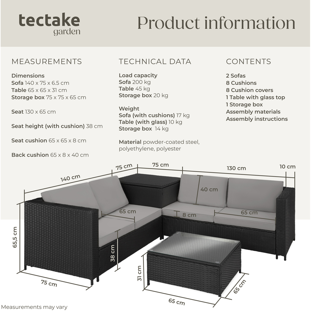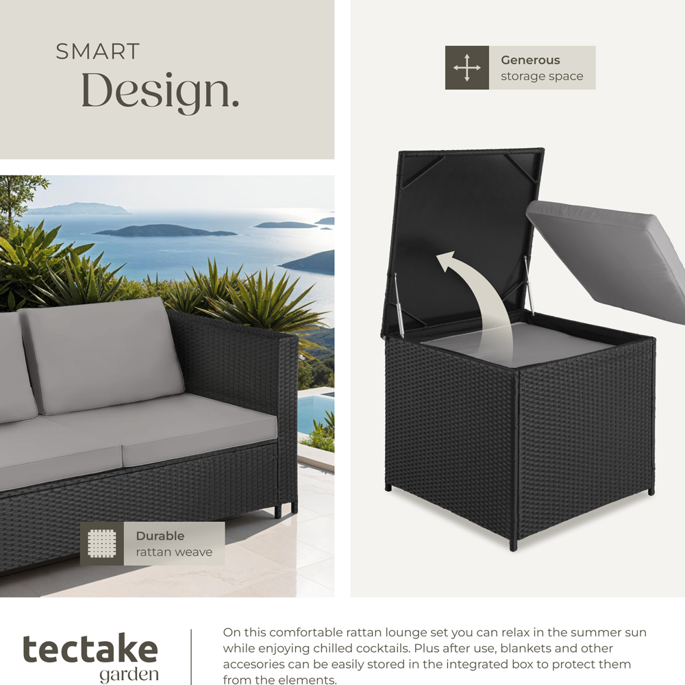 Transform your garden with the Siena garden furniture set from Tectake. This versatile set includes two sofas, a coffee table, and a large storage box, making it perfect for outdoor dining and relaxation. The thick seat cushions provide added comfort, while the storage box is ideal for keeping covers and accessories safe and organized. Made from high-quality rattan, this set combines durability with stylish design, perfect for any garden or terrace. The cushions are 8cm thick, ensuring a cosy seating experience, and their removable, water-resistant covers make cleaning a breeze. The frame is constructed from powder-coated steel with rust-free stainless steel screws, ensuring longevity and weather resistance. The set includes a square table with a sturdy glass top, perfect for drinks, snacks, or decorative items. The glass is easy to clean and can be removed to convert the table into a footrest for added versatility. Designed with a stylish rattan weave, the set is both UV-resistant and weatherproof, making it highly durable. The modular design allows you to arrange the pieces to suit your space, whether in a cosy corner setup or as a bench. The practical storage box with a hydraulic lift offers ample space for pillows and other outdoor essentials, keeping them protected from the elements. The Siena rattan dining chairs and lounge set add a touch of elegance to any outdoor space. With a robust steel frame, comfortable cushions, and a versatile table, this set is perfect for those who value both aesthetics and practicality. Whether hosting a dinner party or enjoying a quiet afternoon, this set meets all outdoor needs with style and comfort. Shop now to add this elegant, functional set to your home and enjoy free delivery. Complete the outdoor collection with parasols, loungers, and additional furniture for the perfect setup.