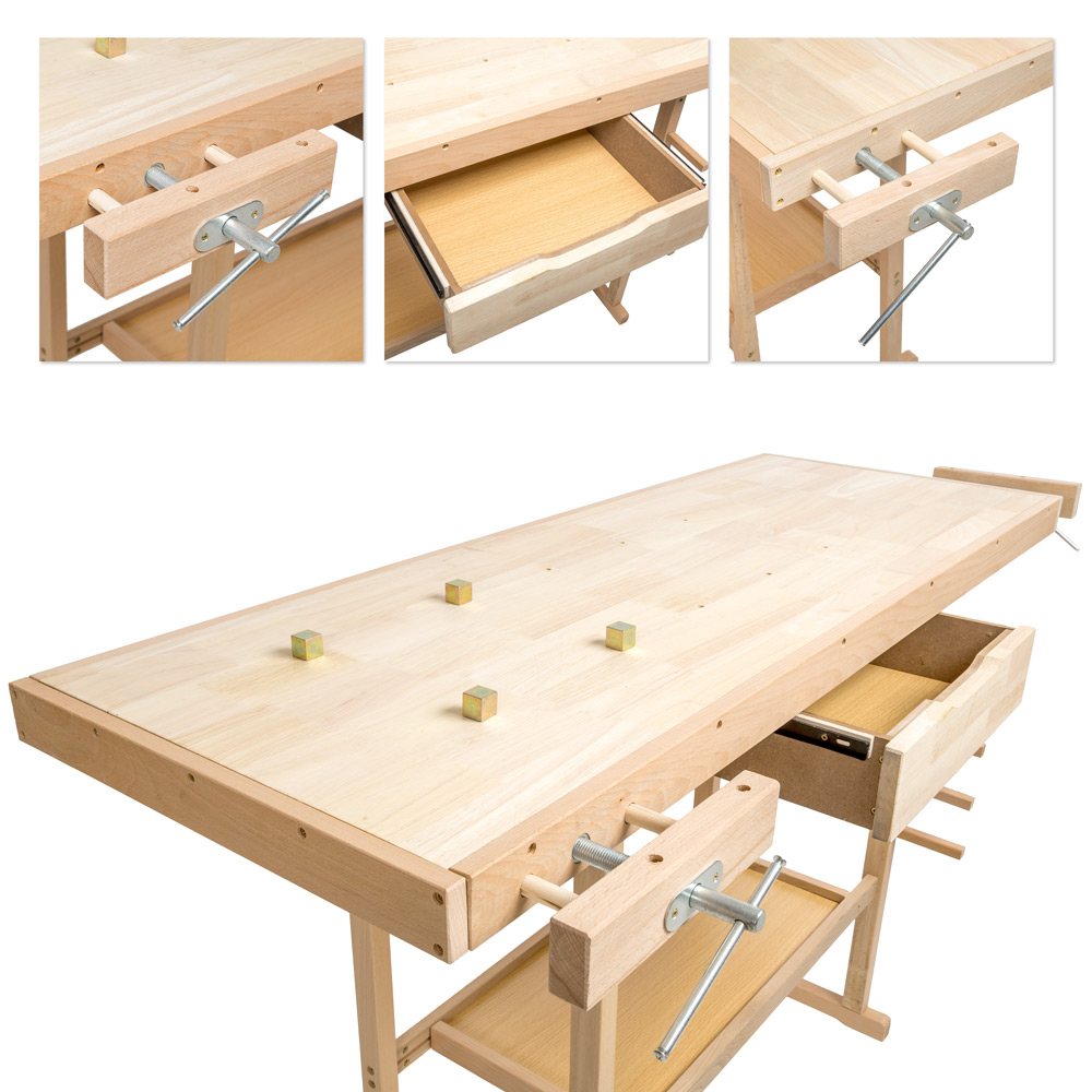 Whether for hobby craftsmen or professionals, this workbench offers what you need. This sturdy, heavy-duty universal wooden workbench with two wooden vices is the optimal workshop equipment. Your tools can be stored in the spacious drawer or the clipboard of the workbench. This way, your tools are sorted and always at hand. The two vices and workbench hooks on the worktop fix workpieces firmly and securely. The workbench is made entirely of wood, and the sturdy wooden worktop of the workbench meets all the requirements of a modern workshop and heavy-duty use. This workbench from tectake will be a great addition to your tools, whether in your hobby room, workshop or garage.