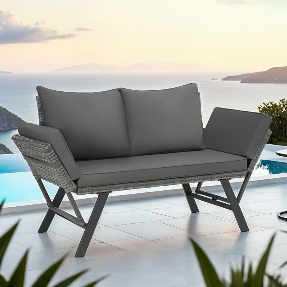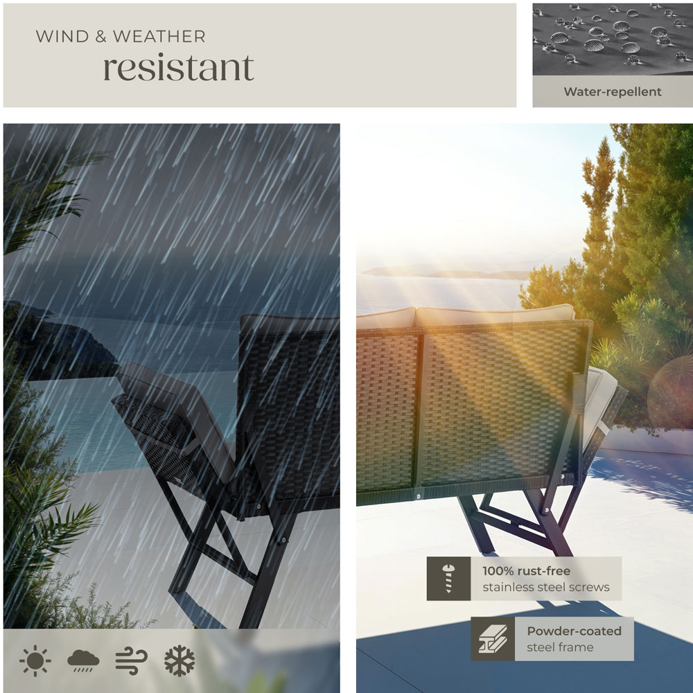 The Rattan lounge sofa Sintra from tectake combines design and comfort for your outdoor area. The chair always meets your needs and offers various uses with its 2-in-1 function for true relaxation. The thoughtful construction makes the rattan couch a true highlight everywhere. The armrests can either be used as such or they can be folded down to create extra space. This way, the sofa can serve as a two-seater. The super-thick seat cushion and the extra-soft back cushions complete your relaxation experience. The cushion also features holding straps with hook and loop fasteners, allowing it to be securely fixed to the armrests and preventing annoying slipping. The high-quality polyrattan weave is durable and low-maintenance. The stainless steel screws are rust-proof. The sturdy powder-coated steel frame is strong and weather-resistant. The water-repellent cushion covers are made of durable polyester and can be easily removed and washed thanks to zips. The Rattan lounge sofa Sintra from tectake impresses with its successful combination of versatility, high-quality workmanship and modern appearance. Get this perfect combination now and create your own holiday paradise. Transform your outdoor living space with this premium rattan corner sofa set. Designed for comfort and style, this versatile garden furniture features plush cushions and integrated storage, perfect for entertaining or relaxing. Ideal for modern home gardens, this durable dining and seating ensemble offers a chic solution for outdoor lounging and social gatherings.