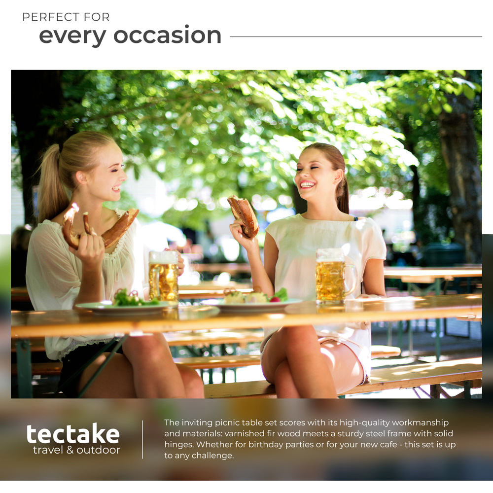 Make your garden the ultimate gathering spot with the picnic table set Sissi from tectake. This three-piece set includes a spacious table and two comfortable benches, accommodating up to eight people, perfect for garden parties and social gatherings. Constructed from durable fir wood with a water-repellent protective coating, the set is built to withstand the elements and offers long-lasting stability thanks to the steel frame. The set's highlight is the two comfortable benches, providing seating for hours of relaxation. The benches and table can be easily folded for convenient storage, making it perfect for those with limited space. Ideal for outdoor dining, this versatile picnic set is perfect for your home and garden. Whether hosting a barbecue or enjoying a family meal, this practical furniture set is sure to elevate your outdoor space.