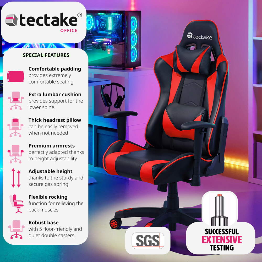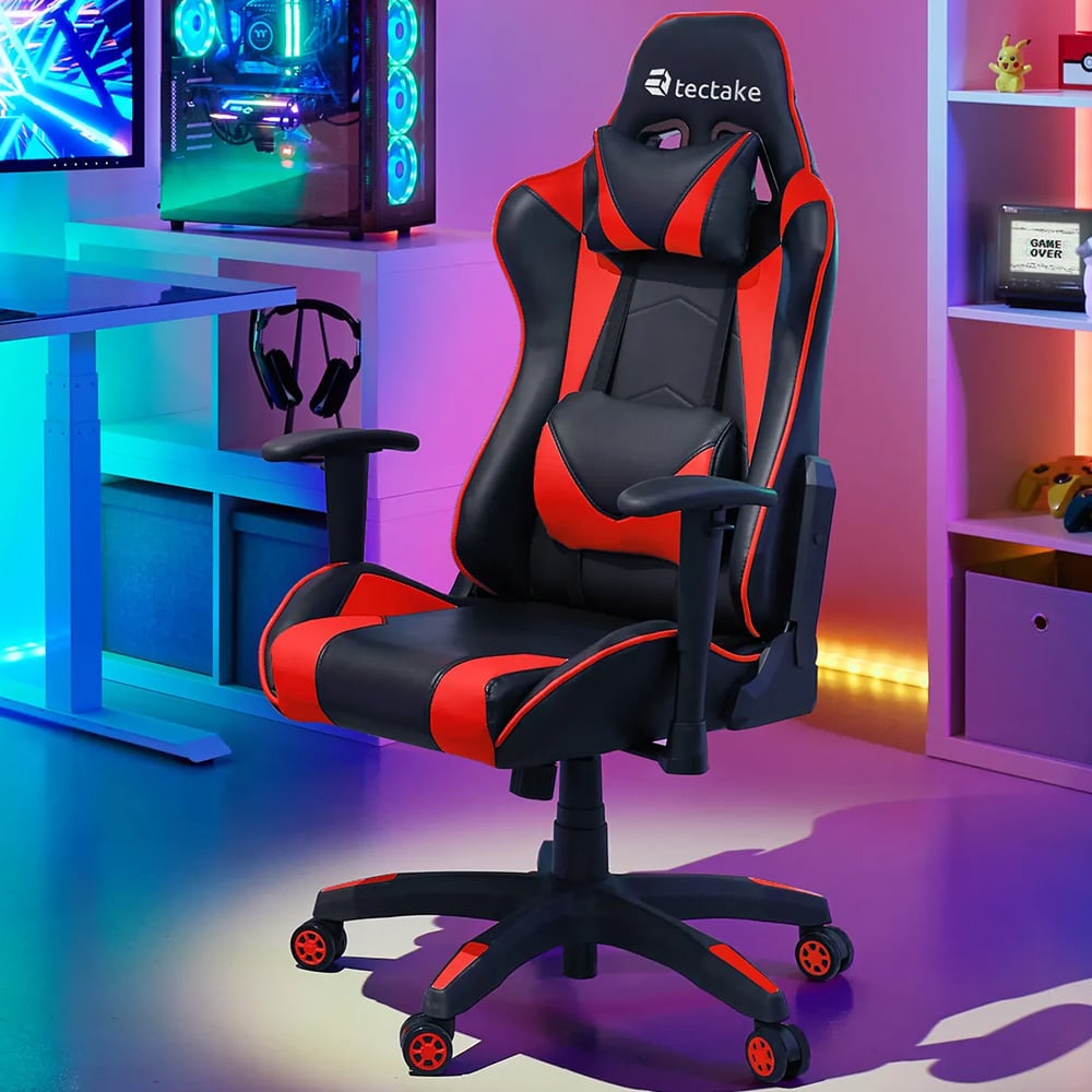 This versatile gaming chair Stealth from tectake, is ideal for concentrated office work as well as passionate gaming. The office chair's ergonomic shape, thick padding, adjustable armrests and seamlessly adjustable gas springs guarantee a comfortable, healthy sitting position for any gamer. The racing chair features five double castors which are floor-friendly, abrasion-resistant and very quiet. The various plastics used offer a high level of stability and durability. The surface of the seat and backrest of this office chair is lovely and soft, so you can work or game in maximum comfort. This gaming chair from tectake, with its stylish design, is perfect for your home or office, so order yours today.