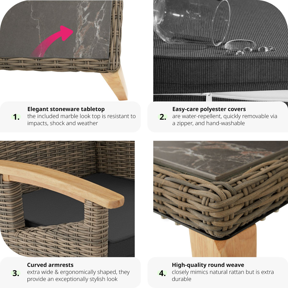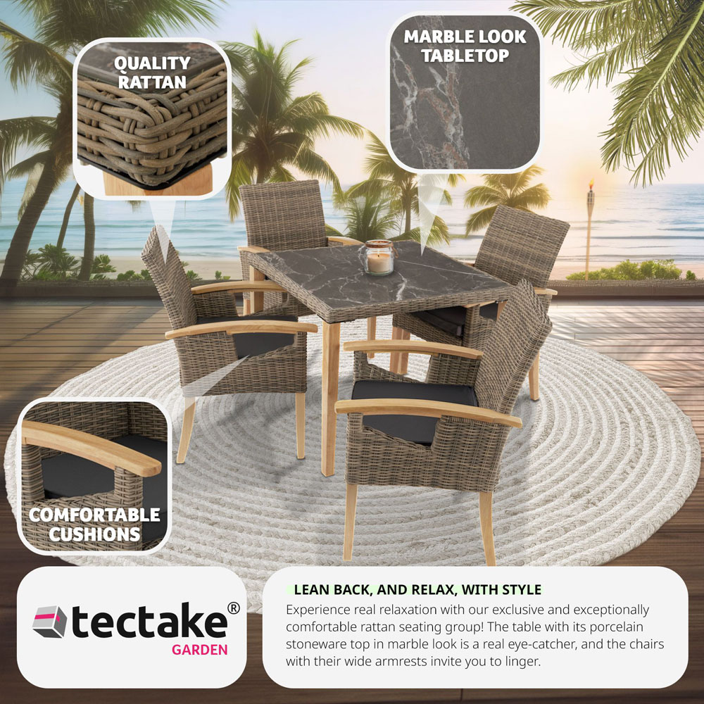 Greet the day with a good breakfast or end the evening with a cool drink at this stylish garden table and chairs set from tectake. The outdoor dining set's interesting combination of wood frame, plastic rattan weave, wooden elements and solid porcelain stoneware table top is a real eye-catcher. The materials used for the furniture help with stability, resilience as well as weather resistance, but also mean the set doesn't look out of place within your home, as a kitchen dining set. Of course, comfort is a top priority with this high-quality ensemble - the comfortable upholstery, curved armrests and comfortable backrest make the five-piece garden table and chairs set a dreamlike chill-out zone.