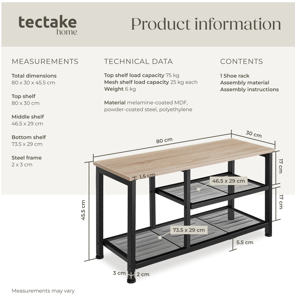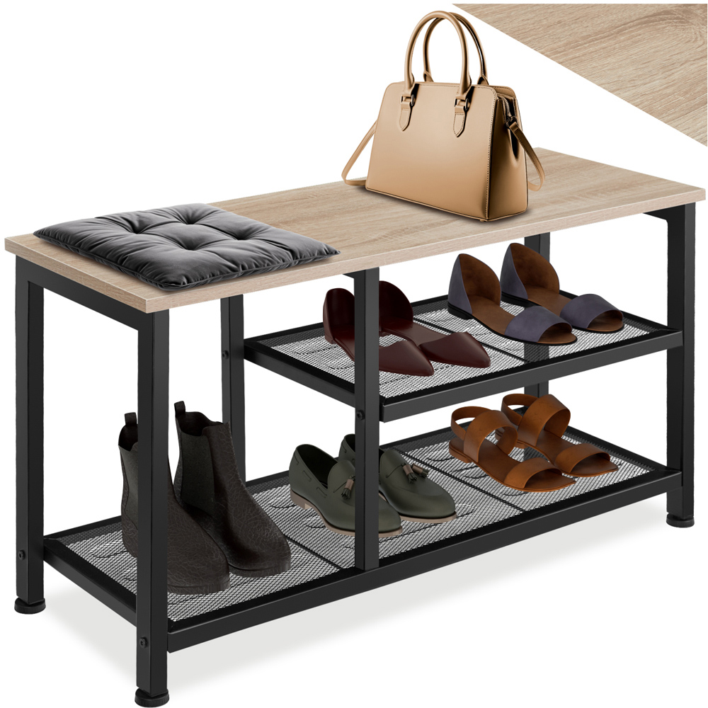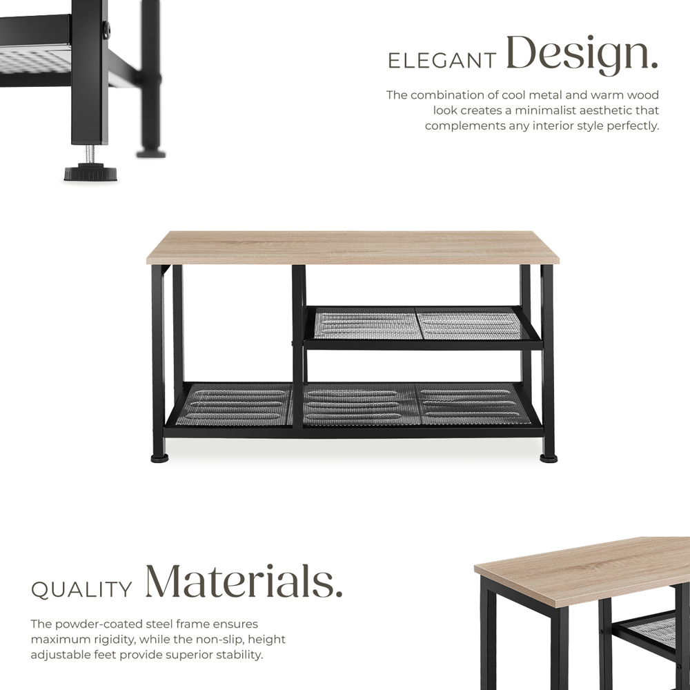 Transform entryways and hallways with a wooden shoe rack that blends a light oak Sonoma finish and industrial style, offering both a surface shelf and two grid shelves for practical shoe storage. Sturdy MDF boards with a melamine coating pair beautifully with a black steel frame, creating a versatile shoe organiser that suits UK homes, offices or modern lofts. Two close-meshed shelves accommodate trainers, boots and more, while the top surface shelf provides extra space for bags or décor, making organisation simple and accessible.