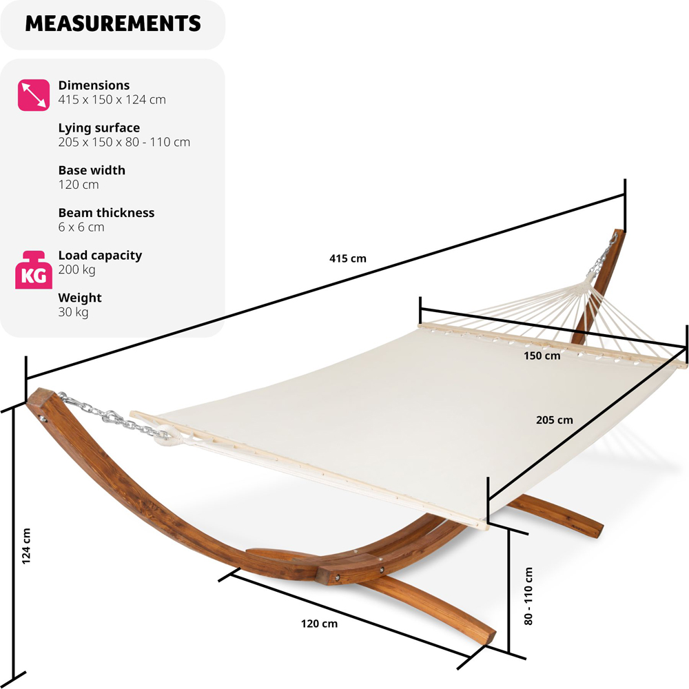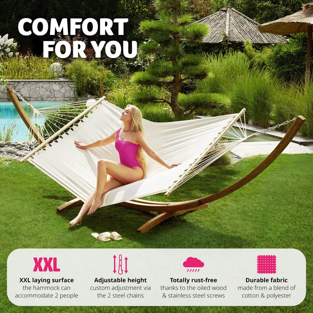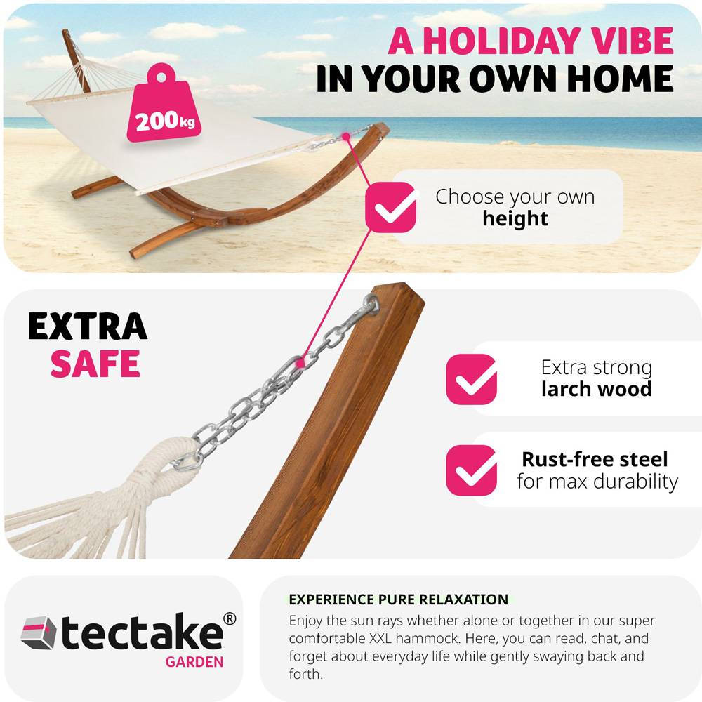 Transform your garden into a personal retreat with the tectake Thorsten 2 Seater White Hammock, the ultimate garden hammock designed for maximum relaxation and comfort. This XXL hammock, perfect for up to two people, offers a luxurious experience right in your backyard. Let the soothing sway of the hammock melt your stress away as you bask in the comfort of a perfectly engineered outdoor leisure product. Easy assembly with sturdy wooden stand, it is quick to assemble. This hammock with stand is designed for effortless setup, allowing you to enjoy your leisure time without any hassle. The durable wooden stand, crafted from high-density larch wood, provides exceptional stability and can support up to 200kg.