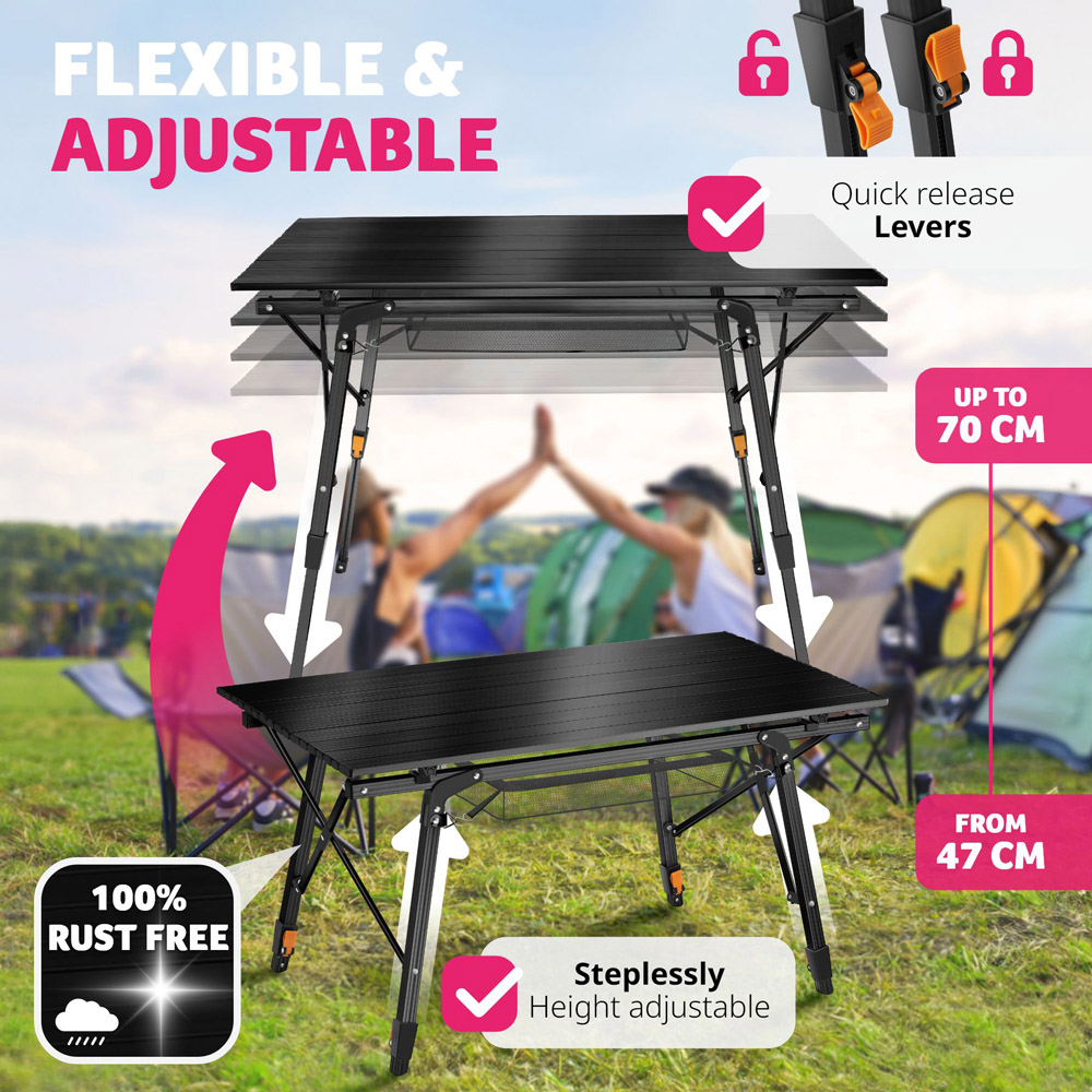 The folding aluminium camping table Tina from tectake, a must-have accessory for outdoor enthusiasts, seamlessly blends functionality with style. Perfect for camping, picnics, and festivals, this table is a key piece of camp furniture. Its foldable design, complemented by a transport bag, makes it a practical choice for those who value space-saving solutions in a small tent. Crafted from weather-resistant aluminium, it's ideal for any outdoor setting, alongside tents, sleeping bags, and other camping equipment. With adjustable legs, it adapts to varied terrains, making it suitable for use with camping chairs. This versatile table not only elevates your camping experience but is also handy for your kid's outdoor activities. Plus, the added net keeps accessories like clothing and small picnic items within reach, and the floor-friendly plastic caps, allow indoor use as well. A valuable addition to your collection of camping furniture, the Tina table offers both quality and affordability, making it a smart choice for those seeking practicality without compromising on style.