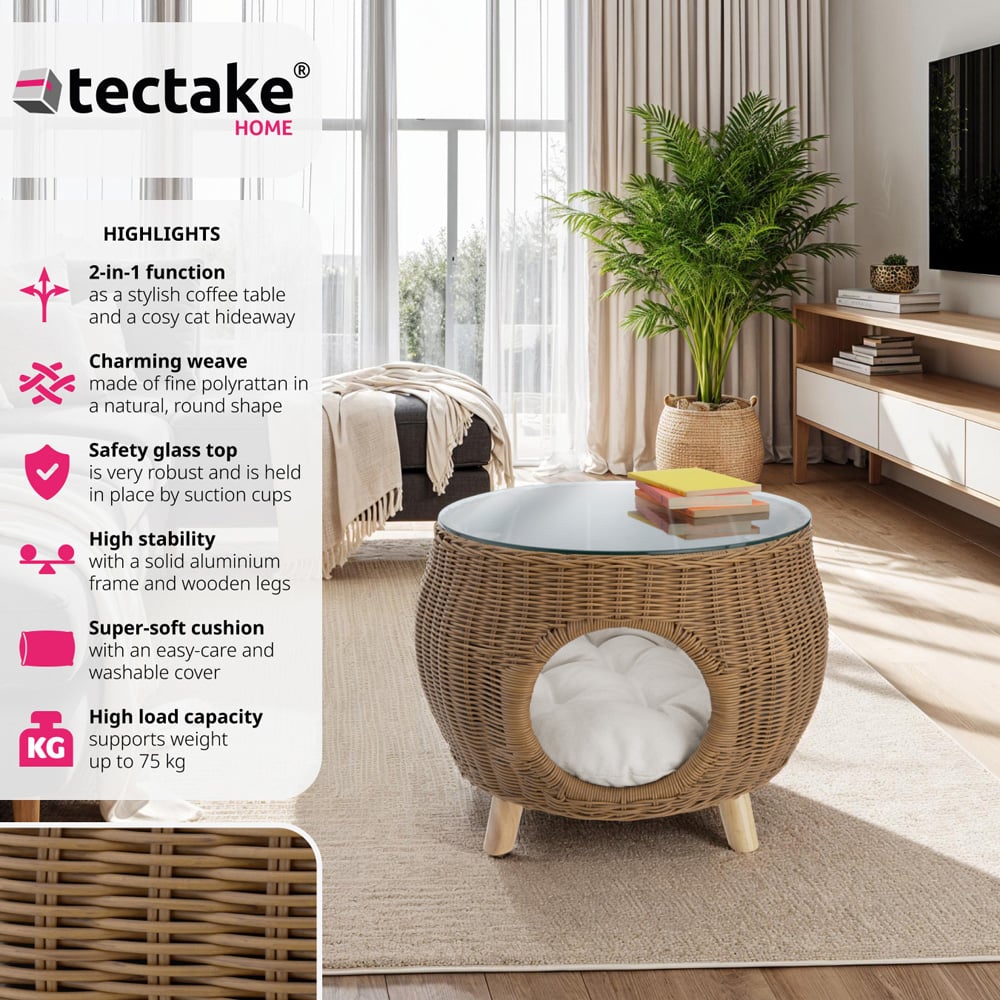 The coffee table Tivoli by tectake is an absolute must-have for all style-conscious pet owners. The wood side table's interior is lined with a super-thick, easy-care and washable polyester cushion - the perfect snuggle paradise for cats or small dogs. The side table impresses with its elegant appearance thanks to the weave of round polyrattan. The tabletop made of extremely robust safety glass is reliably held by suction cups and offers sufficient storage space for drinks, snacks or a good book. The home furniture features large wooden legs and a solid aluminium frame which ensure high stability and load-bearing capacity and also make it weatherproof, ideal for outdoor use. Whether in the living room, dining room, on the terrace or in your reading corner, the functional coffee table Tivoli will elevate your decor to a new level. Dimensions: 54 x 40cm.