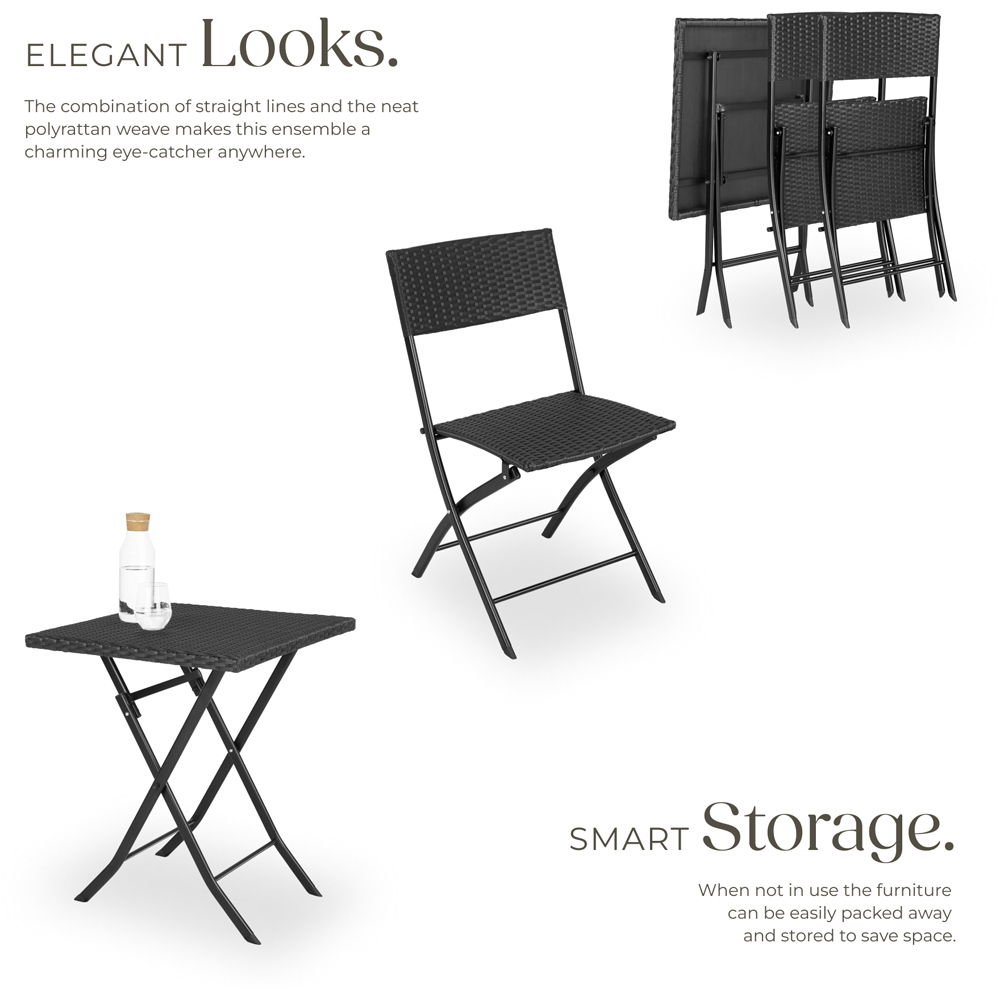 This three-piece rattan garden furniture set from tectake is sure to impress with its chic look, flexibility and comfort. The sets of two chairs and a table make it perfect for enjoying an outdoor dining experience in the sun with a loved one. The compact seating set is ideal for a home with a patio or balcony. When not in use, the individual elements can simply fold up for storage. The table and both chairs are made from powder-coated steel, while the fine woven elements are made from durable poly rattan and are delivered pre-assembled. The combination of a robust frame and lightweight design make this low-maintenance rattan set perfect for transport and camping. Enjoy a romantic meal in the great outdoors with this rattan garden furniture set from tectake.