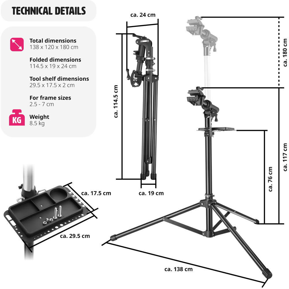Make bicycle maintenance a breeze with the Tristan bike repair stand from Tectake, designed to accommodate all common frame sizes including e-bikes. This stand features a height-adjustable and fully rotatable clamp that makes accessing any part of your bike easy, whether you're at home or in a professional shop. The robust, powder-coated steel tripod frame ensures stability and durability, while the rubber-coated mounting clamp safeguards your bike's paint from scratches. For added convenience, it includes a magnetic accessories tray to keep tools and screws handy. Its lightweight design and folding function allow for easy storage and transport, making it an essential tool for any cycling enthusiast.