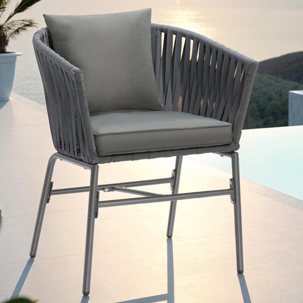 Discover the cosy Valeiras chair set by Tectake and give your outdoor area a stylish upgrade, whether on the terrace, the balcony, or in the middle of the garden. The decorative rope weaving on the continuous arm and backrests give the chairs a very special character, while the thickly padded seat and back cushions promise exceptional comfort. The covers made of easy-care polyester are water-repellent, removable, and easy to wash. The garden chairs also impress with their powder-coated steel frames, which guarantee stability, strength, and durability. In addition, height-adjustable plastic feet protect your floors. Add a touch of sophistication to the space with this elegant accent chair, perfect for any setting. Whether searching for living room chairs to complement decor or a chair for bedroom relaxation, this versatile piece fits seamlessly into the home. Its stylish design combines the comfort of a sofa chair with the practicality of an occasional chair, making it ideal for any corner. This armchair offers premium support and a cosy feel, making it one of the best reading chairs for adults. Use it as a lounge chair for unwinding after a long day or as one of the go-to accent chairs for the living room to add charm and character. Perfect as part of living room armchairs or as a standalone bedroom chair, this piece brings comfort and style to every corner of the home. Create the ideal outdoor oasis with the Valeiras chairs by Tectake.