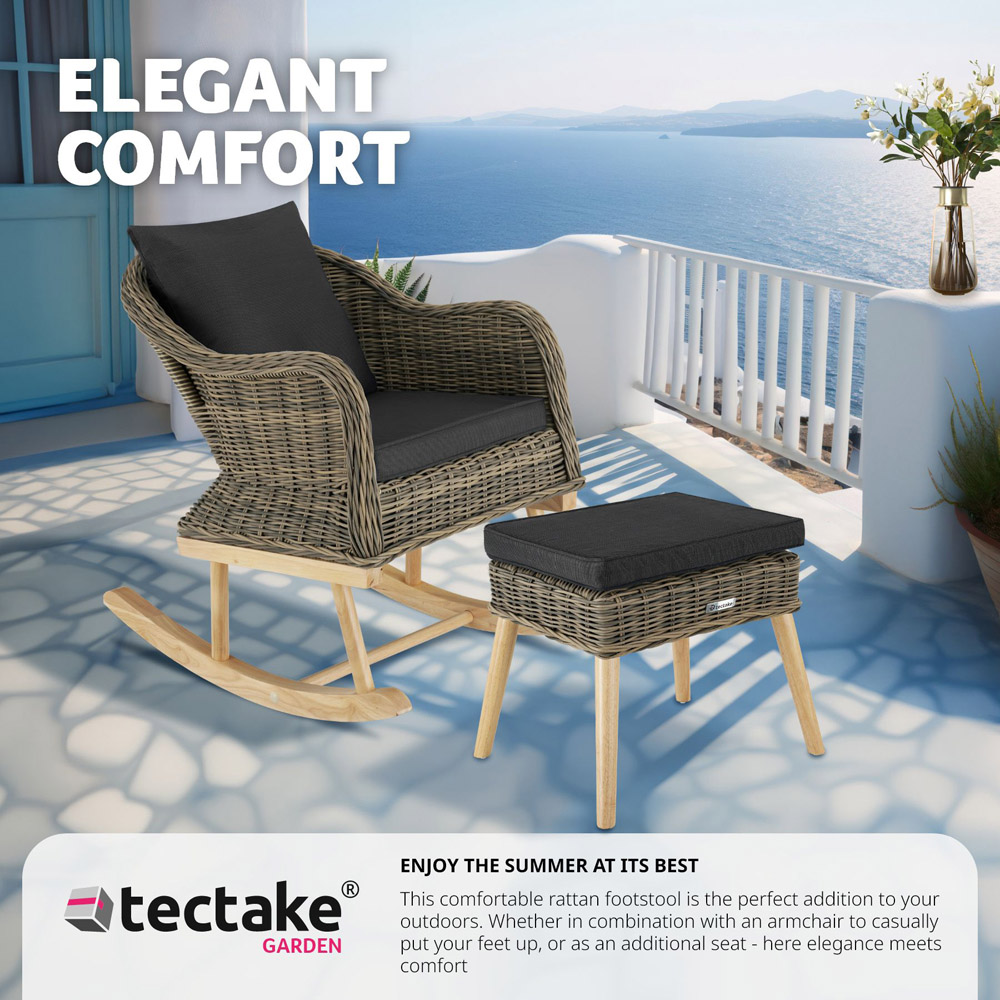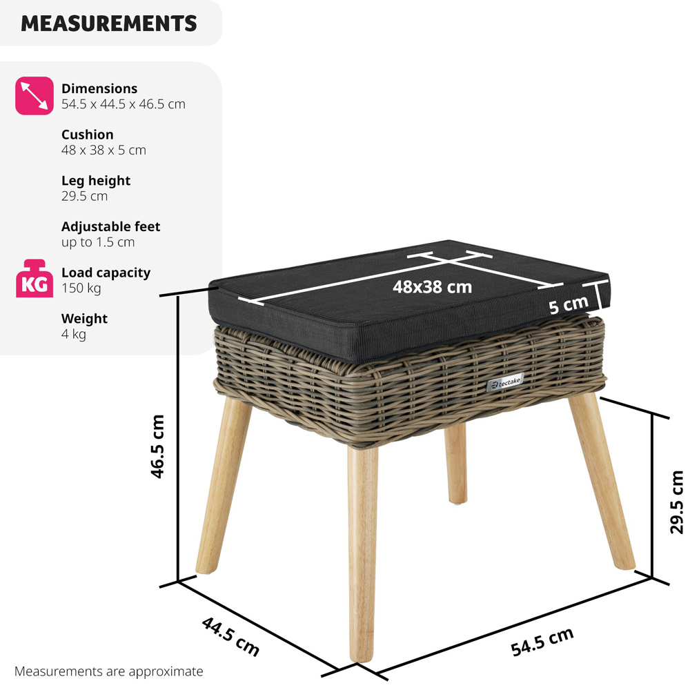 After an eventful day, switch to well-deserved relaxation mode and put your feet up on the comfortable Vibo rattan footstool from tectake. For excellent comfort, the handy stool features comfortable upholstery with a water-repellent cover, making it ideal for use outdoors as well as in any room of your home. The high-quality weave of the pouffe has a natural look, is extremely hard-wearing and just as weatherproof as the light frame made of solid aluminium. One of the footstool's special highlights is the height-adjustable small plastic foot caps, which are hidden under the flared legs made of solid wood so you can ensure stability even on uneven surfaces. The ottoman is ideal to combine with other furniture such as a sofa or dining table set for optimal comfort.