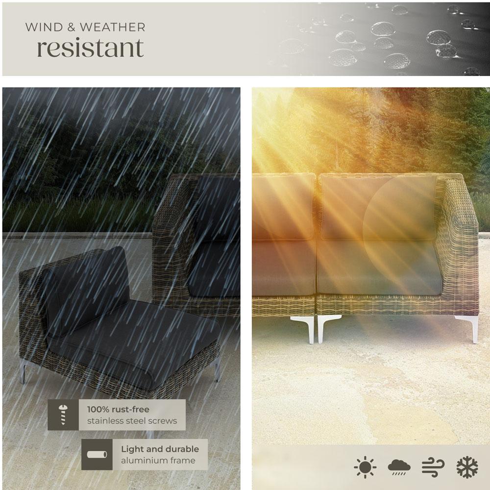 Anyone who appreciates cosiness and a well-thought-out design will be impressed by the large corner armchair of the modular Villanova rattan garden furniture from tectake. The chair's upholstery, which is as thick as it is soft, adapts gently to the body and conveys a relaxed feeling of well-being that lets you forget the stress of everyday life. The outdoor furniture is characterised by the high-quality weave, which not only impresses with its attractive, natural appearance, but also with its high durability. The light aluminium frame and four solid legs with floor-protecting plastic cap accessories provide high stability and resilience, making it perfect for use outdoors but also in your kitchen or living room. Combine this stylish corner chair with other products from the Villanova range to create the perfect lounge or dining set for your home from tectake.
