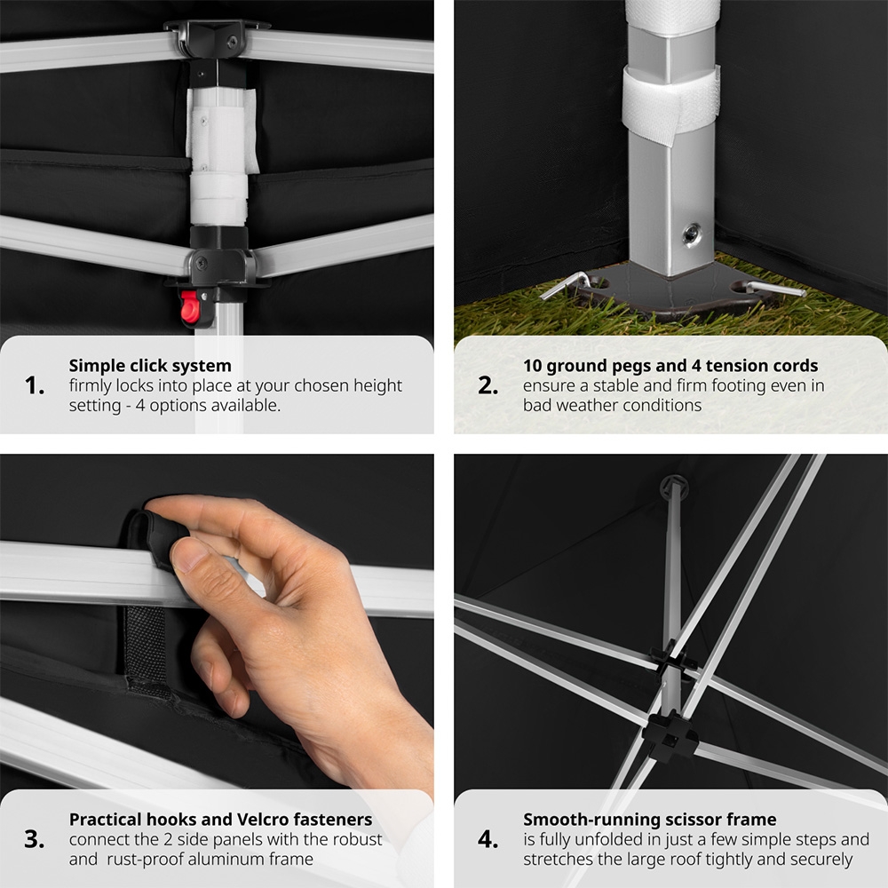 Enjoy relaxing hours spent under the protective canopy of this collapsible tectake Viola 6 x 3m Black 2 Side Panel Gazebo. In just a few steps, the easy assembly scissor frame with simple click system is ready. The roof and side panels are secured to the robust frame with hooks and hook and loop fasteners. The height of the stainless and waterproof pavilion can be varied as required. The gazebos large footfall provides plenty of protected space for other furniture such as tables and chairs. For easy transport and space-saving storage, this collapsible pavilion can be stored in the bag provided. The gazebo is perfect for all kinds of outdoor fun: in your home garden, on the patio, at the park or down the beach. A clever solution for enjoying the outdoors, no matter the weather: the versatile, collapsible gazebo from tectake.