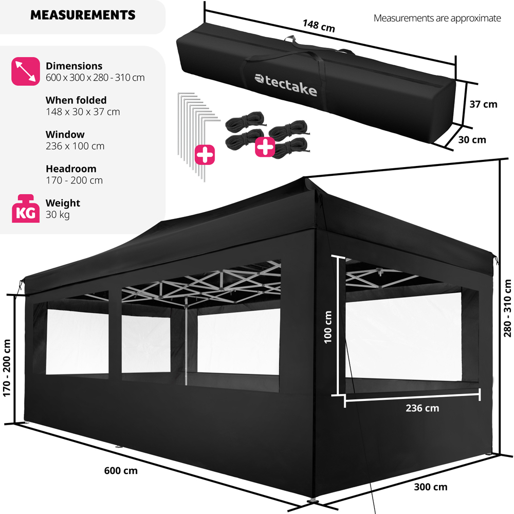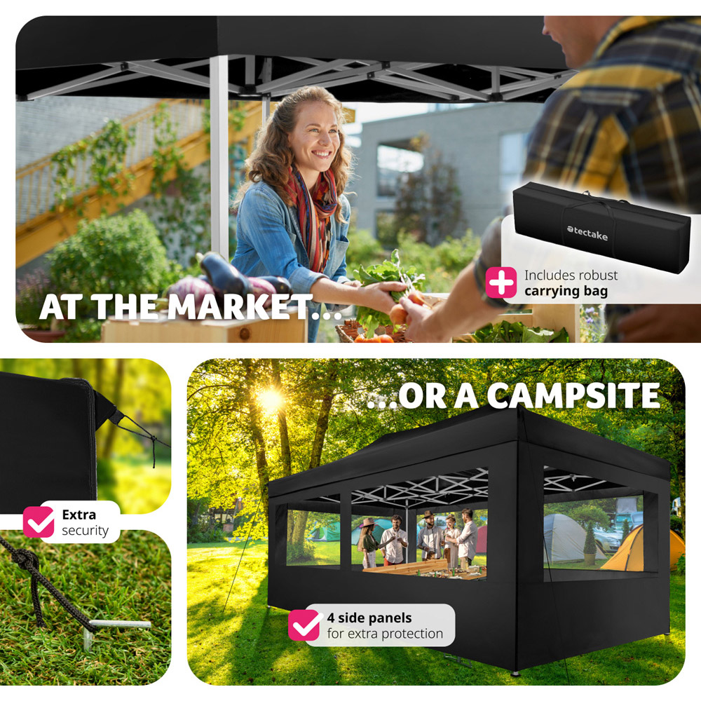Relax with nature as your backdrop under the canopy of this collapsible pavilion from tectake. In just a few minutes, this easy scissor frame with simple click system is ready. The height of the stainless and waterproof pavilion can be varied as required. For easy transport and space-saving storage, this collapsible tent can be stored in the bag provided. Can be used in the home garden or for outdoor special events. A well-considered construction: the functional collapsible pavilion from tectake.