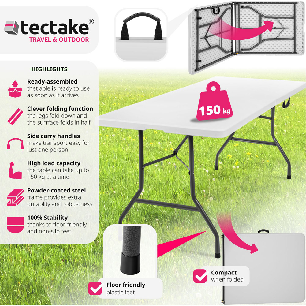 Enjoy relaxing hours at home, in the garden or on the road for a camping trip with this foldable camping table from tectake! You are perfectly equipped with this folding camping table for a picnic with nature. The plastic table top is resistant to moisture and other environmental conditions meaning it is well adapted to the unpredictability of the British summer. The folding table can be collapsed in just a few steps to save space when stored at home or transported in your car. The non-slip feet ensure a safe position on almost all surfaces and prevent scratches if the table is used indoors. The table can be used alongside camping chairs to ensure a comfortable experience. The steel frame is very sturdy and durable, essential for outdoor use. This camping table is the perfect, transportable dining table for you and your family.