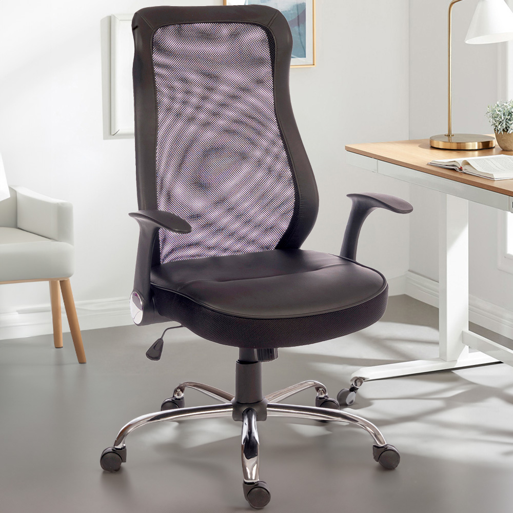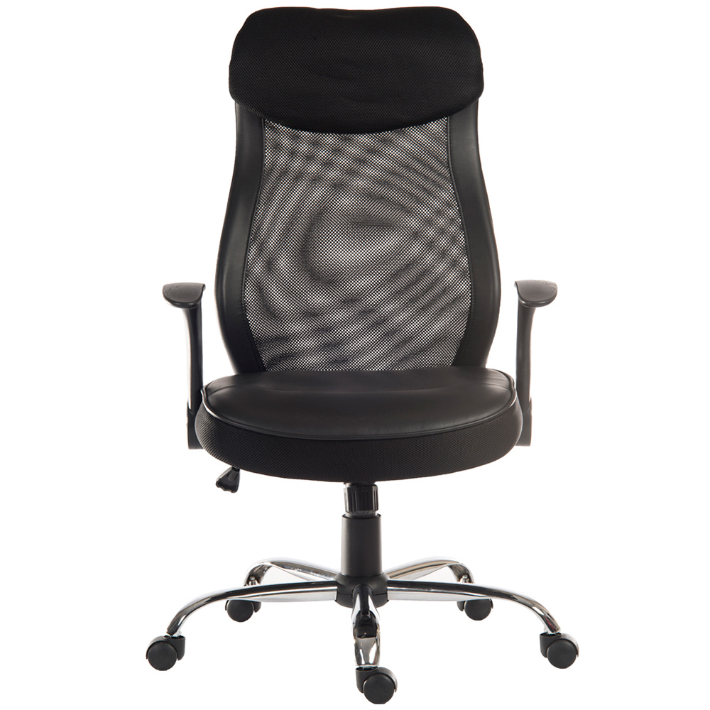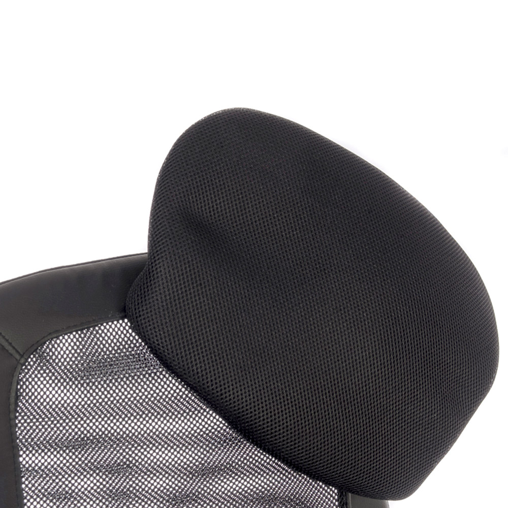 The Teknik Office Curve Contemporary Mesh Executive chair is a fabulous complement for all office scenarios with its curvy aerated backrest, sleek retractable nylon armrests, stylish steel base and its black, height adjustable, comfortable leather look padded seat. It has a reclining function with tilt tension, with a nice high backrest, which also includes the unique feature of a removable headrest. This chair is great for up to eight hours of usage per day and is rated to 110kg, making it the perfect option for your home or work office.