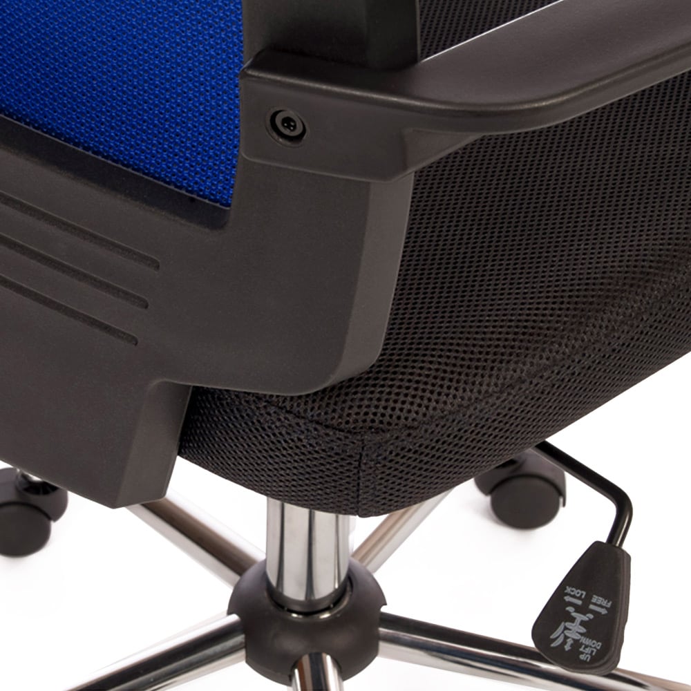 The Teknik Office Star Blue Mesh backed chair with a durable black fabric padded seat and fixed nylon fixed armrests is a fantastic entry-level chair for all home and work office surroundings. It has an aerated backrest, gas lift seat height adjustment with a recline function and a tilt tension to make this a great addition for all tastes. Durable for part-time work, up to three hours a day and rated to 90kg. This chair has a smart chrome base included and is also available in white or black mesh-backed fabric.