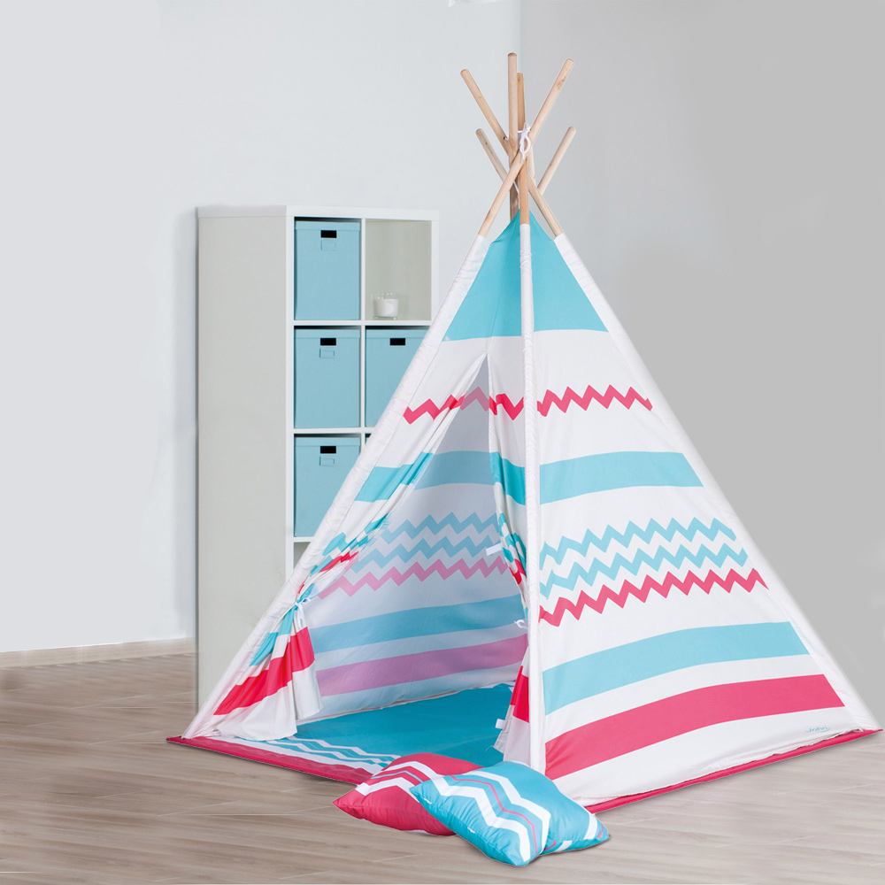Add a touch of originality to your child's bedroom or playroom with this John Tepee Tent with Blanket and Cushions. Its lovely pattern along with natural colours and a wooden frame makes it a perfect fit for any type of interior. This tepee comes with two cushions and a very comfortable floor mat to create a perfect welcome corner. Easy to use, it comes in a carry bag that will allow you to carry it everywhere. The tepee will allow your child to play in his own space and invent, alone or with his friends, stories comfortably installed in his hiding place. Suitable for use in gardens, patios, balconies, playrooms, and more. Ideal for children above three years. The pack includes a play tent, padded ceiling, blanket, two cushions, twelve rods, eight connectors, an instruction manual and a storage bag. Size: Tent - 120 x 120 x 160cm, blanket - 122 x 122cm and cushion - 28 x 28 x 15cm. Care and use: Clean the product only with a damp cloth after usage; do not use other cleaning products. All product parts must be completely dry before being packed away and stored in a cool and dry place. Main parts must be checked before assembly to prevent possible hazards.