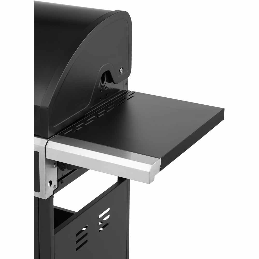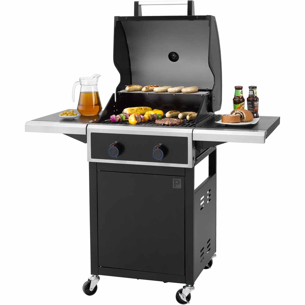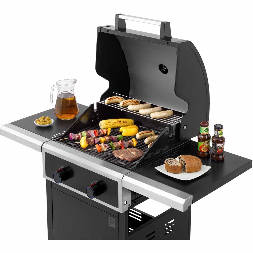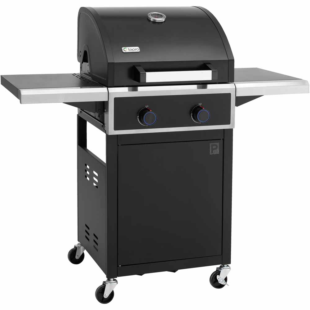 The Keansburg Two Gas BBQ Grill has two 3.2kW stainless steel burners with push and turn-ignition and a generous 51 x 43cm cooking area, supported by a chrome-plated warming rack allowing you to continue cooking while keeping food warm. The cast iron grill grid has a removable insert, compatible with Tepro’s Grid-in-Grid accessories, available to purchase separately. These include a cast iron pan, pizza stone, wok, pastry inlay, Dutch Oven and poultry roaster (available to purchase separately). With the option to cook using direct or indirect heat, you can create anything from perfectly seared steaks to slow-cooked, juicy ribs. The temperature in the cooking chamber can be monitored using the thermometer built into the lid. A removable grease tray collects juices and fat for easy disposal, aiding in cleaning. This attractive barbecue has a powder-coated framework with contrasting stainless steel trim and lid handle. A cabinet under the grill has a holder for a gas bottle with room to store a 5kg, 8kg or 11kg gas bottle, while the push door discretely hides the bottle. Two foldable side tables provide useful preparation space. Mounted on four swivel casters, two of which are lockable, the Keansburg two can easily be positioned where required. The working height is a comfortable 85cm. The Keansburg 2 Gas BBQ is supplied with a gas hose and regulator. Keep your BBQ covered and protected with our range of premium
