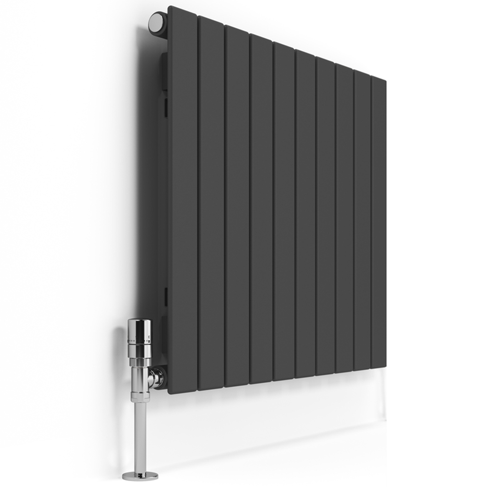 Forte is a flat bar range of designer radiators available in both single or double panel variants; each bar is 70mm wide with a small gap which creates a very seamless looking design set against the wall. The Forte single panel (V10) model is manufactured from a single layer of flat steel profiles mounted on round rear collectors, with a very shallow projection of just 73 mm including fixings, meaning this model is well suited to spaces where the overall projection is limited. Note: Terma also offer a Forte double panel (V20) model which has a deeper projection of 93mm. The metallic grey (aka Anthracite) colour from Terma has a matt, rough texture. Terma offers a 150x50mm colour chip of this finish should you wish to see the colour prior to purchase. The Forte range have the unique feature that they can be installed either... vertically with the bars running up and down (valves connected on the sides)... or they can be installed horizontally with the bars running left to right (valves connected on the undersides). The same physical model you buy can be installed either way up giving maximum flexibility dependant on your space requirements. See the images for how the radiators look each way up as they can give a very different looking design as you rotate each model and we show images of these fitted both ways for every size. Forte is supplied with a universal bracket which allows the radiator to be installed either way up, full instructions supplied. As you rotate the radiator either way up it changes the view you will have of the brackets from the side of the radiator. With the bars running vertically the brackets are on show, but with the bars running horizontally the brackets are fully concealed from view. See the images for this difference. Forte is pre fitted with an internal diverter (baffle) which is a barrier to aid the flow of water up and over inside the radiator to ensure even heat distribution across all bars. If being installed with the bars running vertically this should be left in place. If this is installed with the bars running horizontally this need to be tapped out (full instructions supplied for the plumber).
