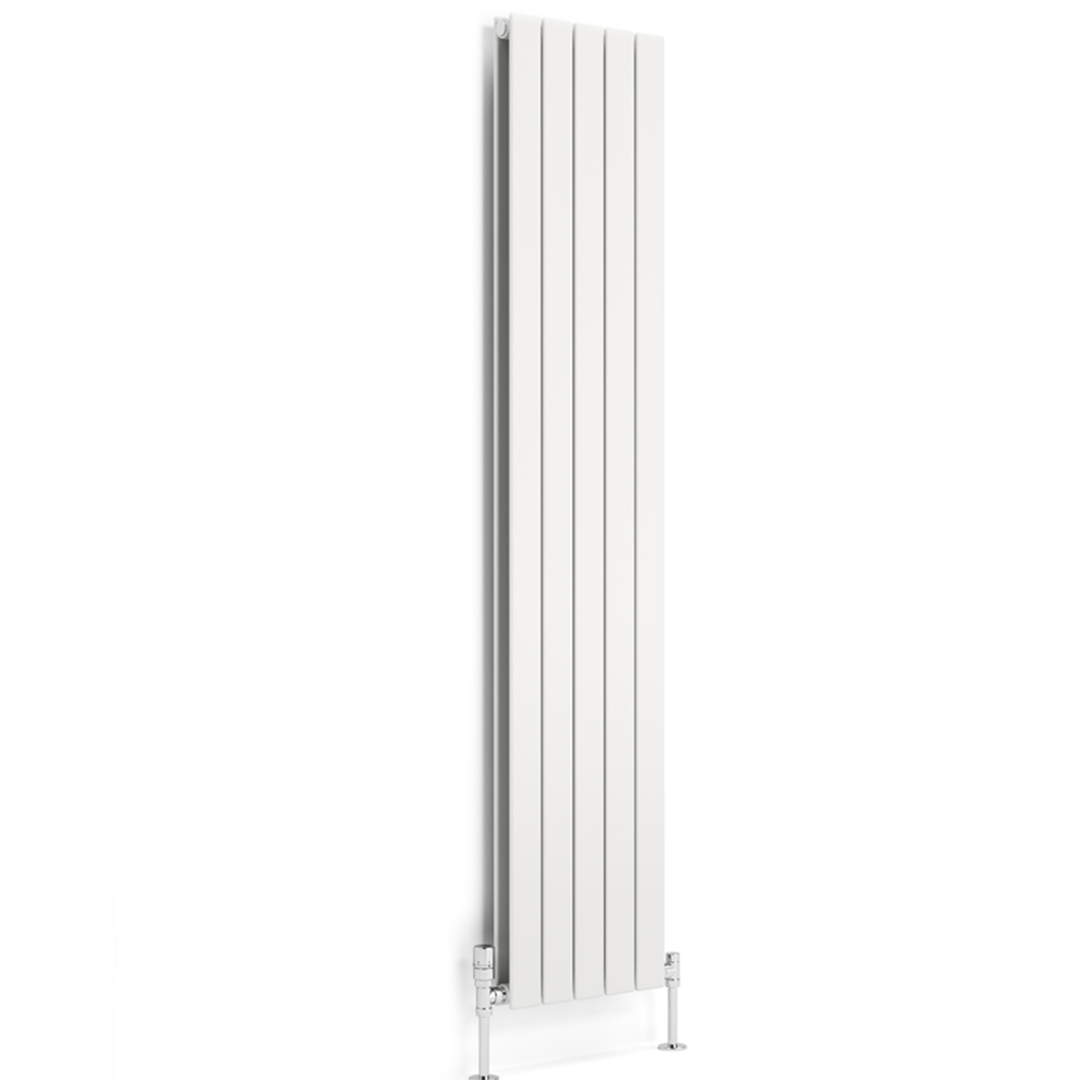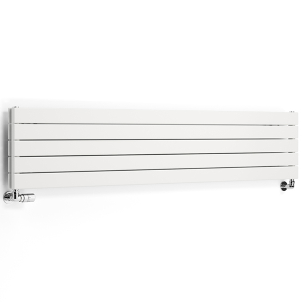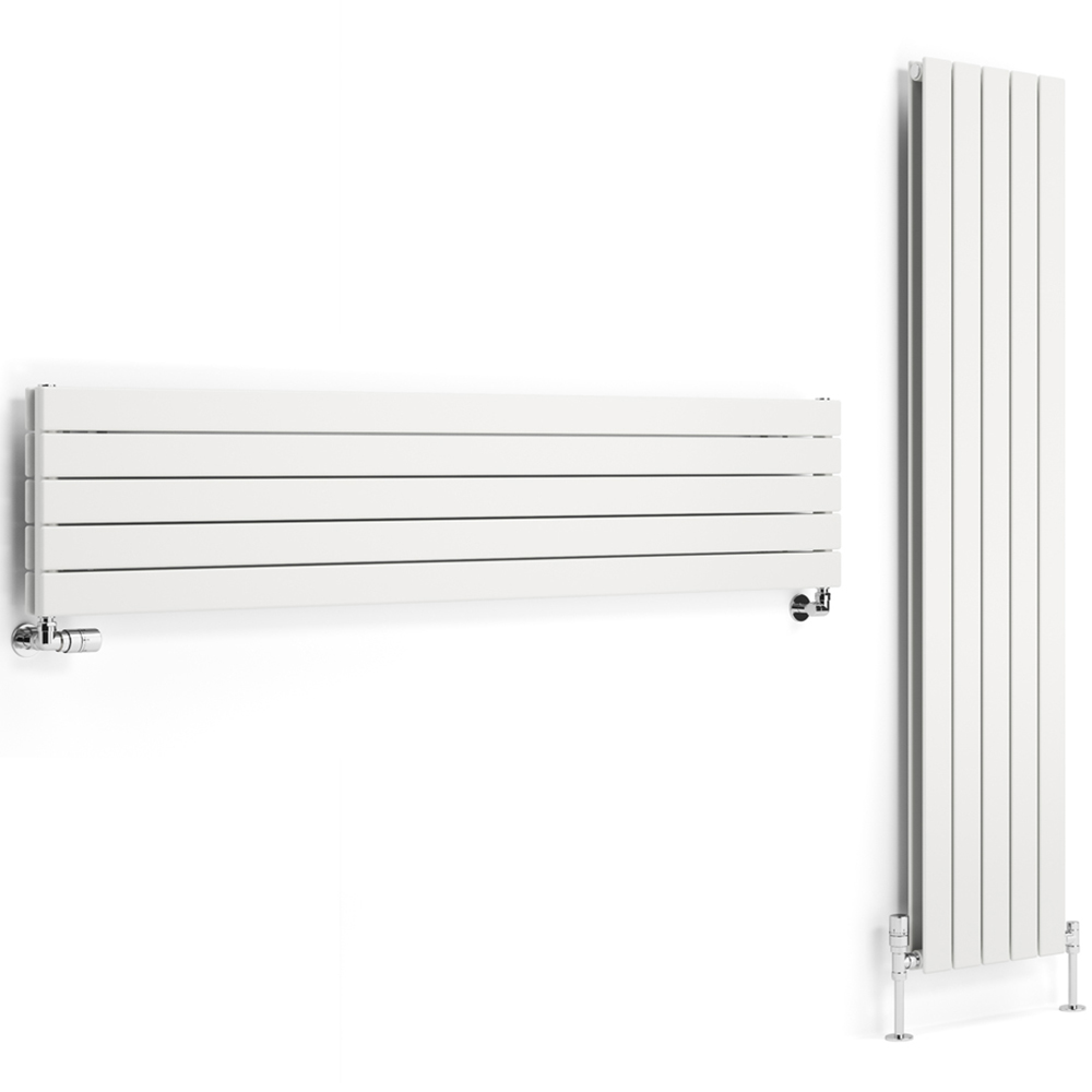 Forte is a flat bar range of designer radiators available in both single or double panel variants; each bar is 70mm wide with a small gap which creates a very seamless looking design set against the wall. This Forte double panel (V20) model is manufactured from a double layer of flat steel profiles mounted on round rear collectors, with a very shallow projection of just 93mm including fixings, meaning this model is well suited to spaces where the overall projection is limited. Note: Terma also offer a Forte single panel model (V10) which has a lower projection of 73mm. This white (RAL 9016) colour has a silk, smooth texture. Terma offers a 150x50mm colour chip of this finish should you wish to see the colour prior to purchase. The Forte range have the unique feature that they can be installed either... vertically with the bars running up and down (valves connected on the sides)... or they can be installed horizontally with the bars running left to right (valves connected on the undersides). The same physical model you buy can be installed either way up giving maximum flexibility dependant on your space requirements. See the images for how the radiators look each way up as they can give a very different looking design as you rotate each model and we show images of these fitted both ways for every size. Forte is supplied with a universal bracket which allows the radiator to be installed either way up, full instructions supplied. As you rotate the radiator either way up it changes the view you will have of the brackets from the side of the radiator. With the bars running vertically the brackets are on show, but with the bars running horizontally the brackets are fully concealed from view. See the images for this difference. Forte is pre fitted with an internal diverter (baffle) which is a barrier to aid the flow of water up and over inside the radiator to ensure even heat distribution across all bars. If being installed with the bars running vertically this should be left in place. If this is installed with the bars running horizontally this need to be tapped out (full instructions supplied for the plumber).
