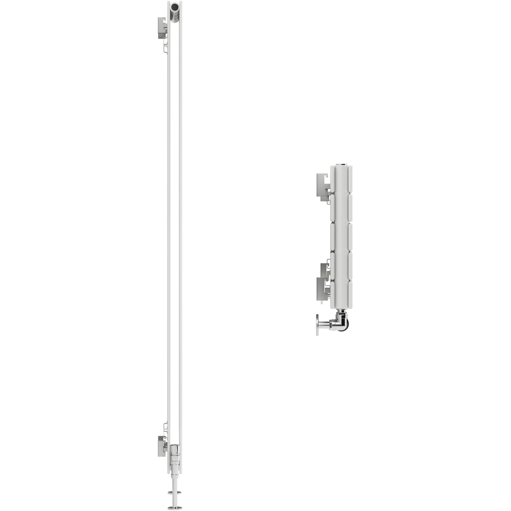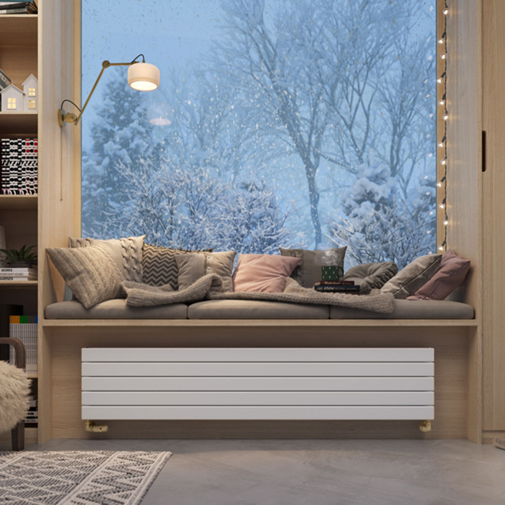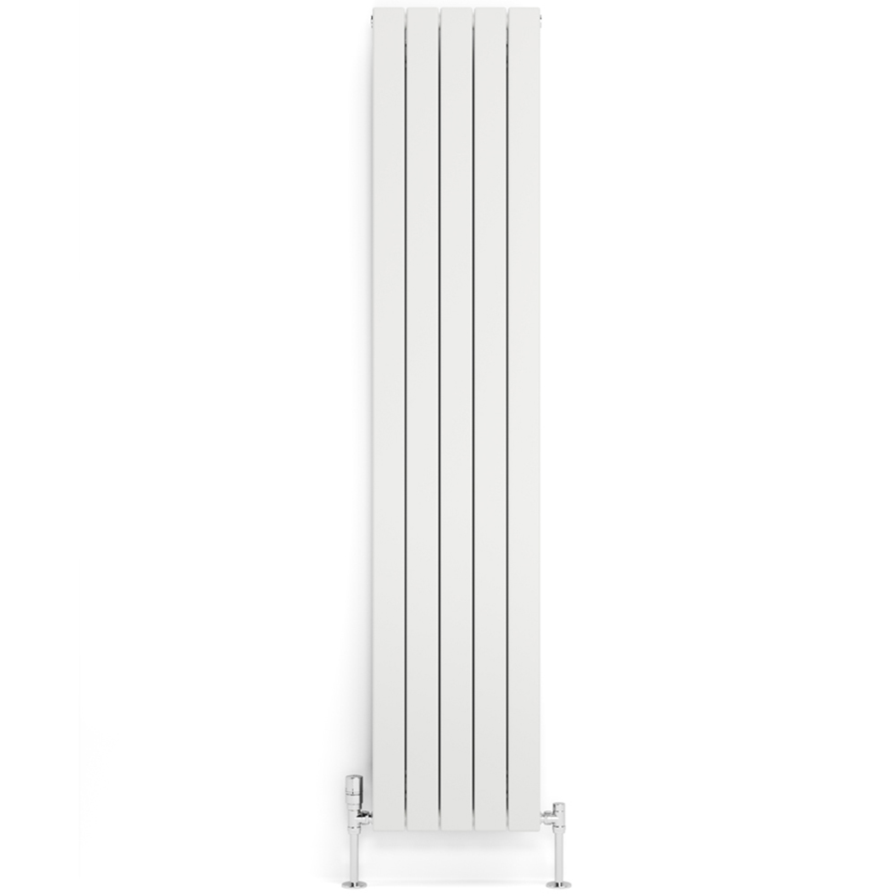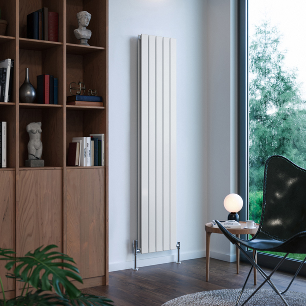 Forte is a flat bar range of designer radiators available in both single or double panel variants; each bar is 70mm wide with a small gap which creates a very seamless looking design set against the wall. This Forte double panel (V20) model is manufactured from a double layer of flat steel profiles mounted on round rear collectors, with a very shallow projection of just 93mm including fixings, meaning this model is well suited to spaces where the overall projection is limited. Note: Terma also offer a Forte single panel model (V10) which has a lower projection of 73mm. This white (RAL 9016) colour has a silk, smooth texture. Terma offers a 150x50mm colour chip of this finish should you wish to see the colour prior to purchase. The Forte range have the unique feature that they can be installed either... vertically with the bars running up and down (valves connected on the sides)... or they can be installed horizontally with the bars running left to right (valves connected on the undersides). The same physical model you buy can be installed either way up giving maximum flexibility dependant on your space requirements. See the images for how the radiators look each way up as they can give a very different looking design as you rotate each model and we show images of these fitted both ways for every size. Forte is supplied with a universal bracket which allows the radiator to be installed either way up, full instructions supplied. As you rotate the radiator either way up it changes the view you will have of the brackets from the side of the radiator. With the bars running vertically the brackets are on show, but with the bars running horizontally the brackets are fully concealed from view. See the images for this difference. Forte is pre fitted with an internal diverter (baffle) which is a barrier to aid the flow of water up and over inside the radiator to ensure even heat distribution across all bars. If being installed with the bars running vertically this should be left in place. If this is installed with the bars running horizontally this need to be tapped out (full instructions supplied for the plumber).